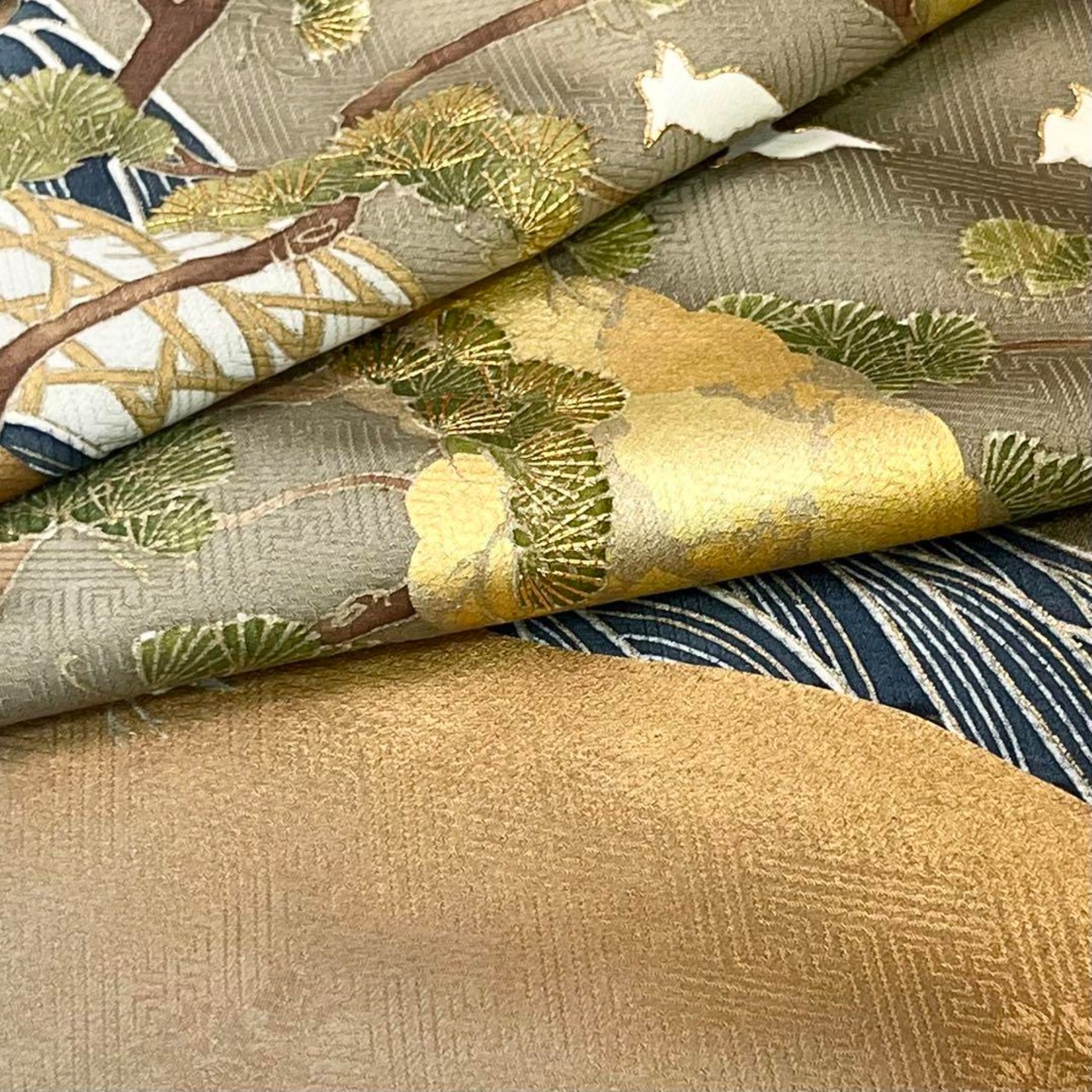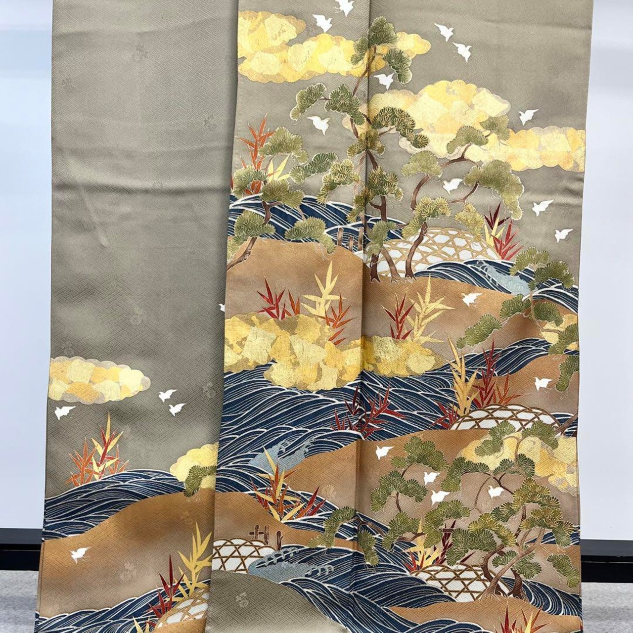 黄海松茶色の落ち着きのあるお色に紗綾形の地模様、金彩の煌びやかな印象の松波模様、雲、鳥の柄裄がデザインされた素敵なお品でございます。