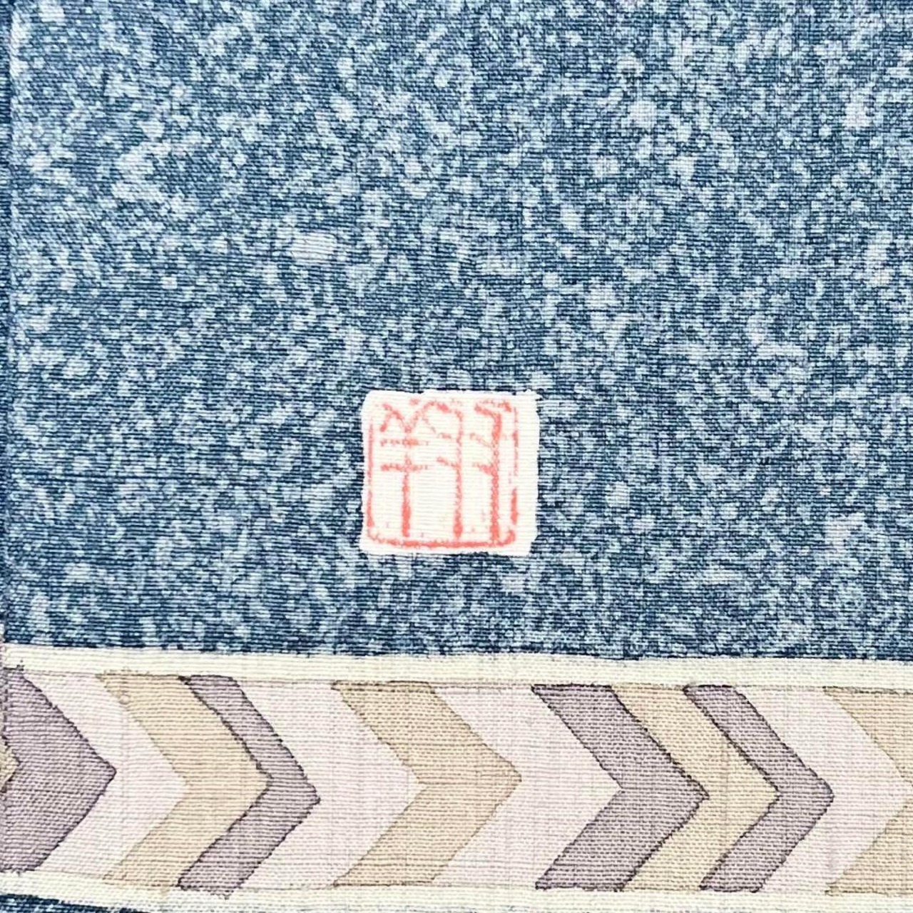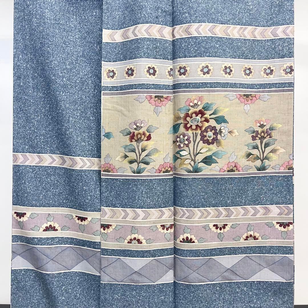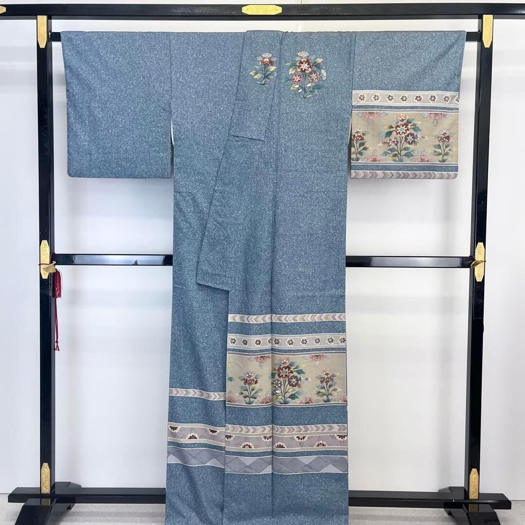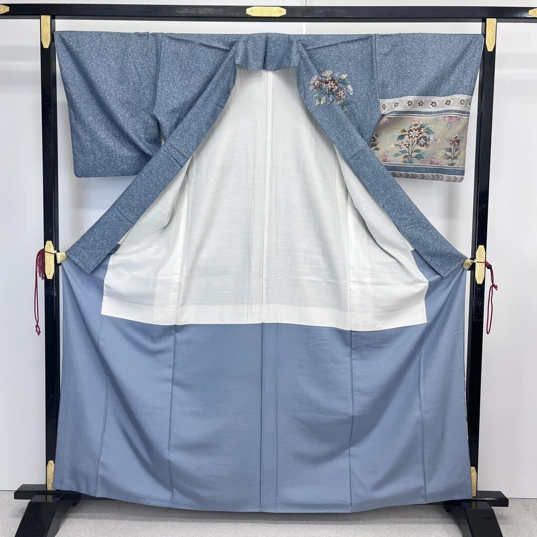 沈香茶色の青味の紬地に叩き染、螺鈿が使われた横縞花模様がデザインされた素敵な柄裄のお品でございます。
