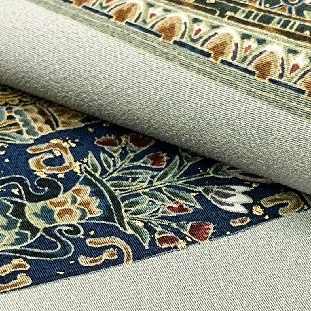 根岸色の縮緬に染めの壁画風の柄裄がデザインされた素敵なお品でございます。