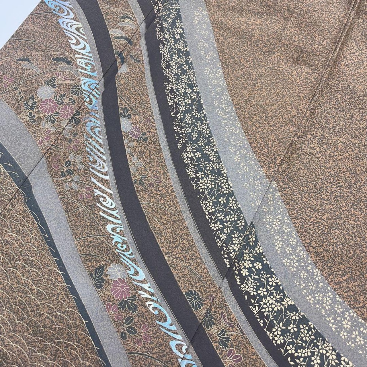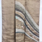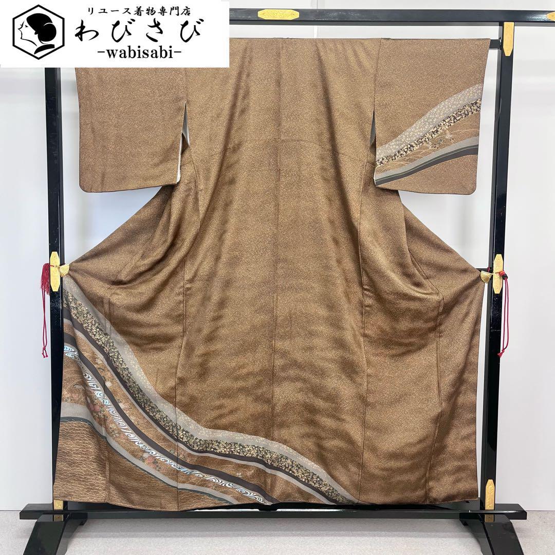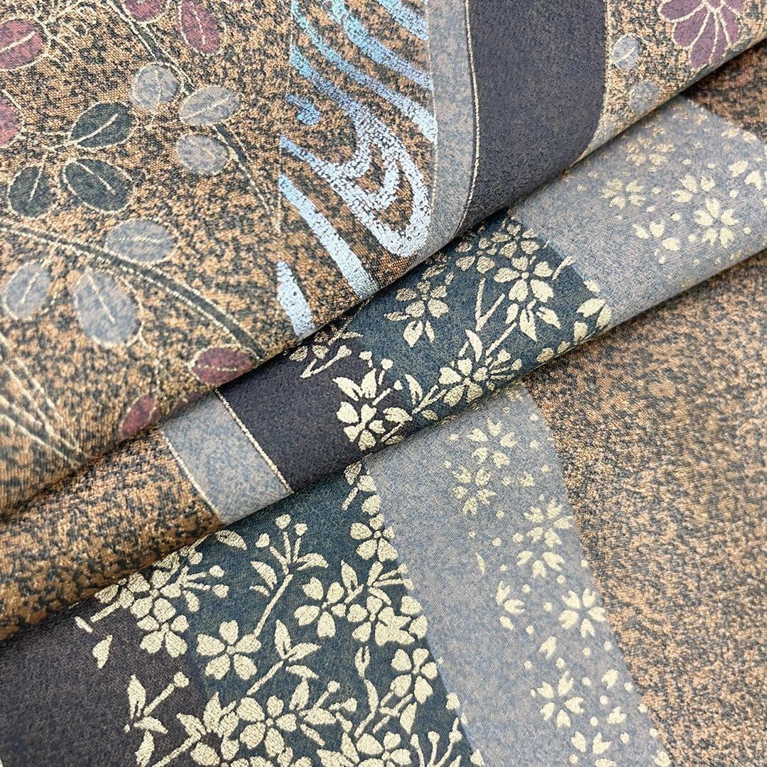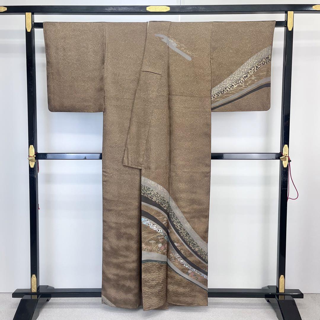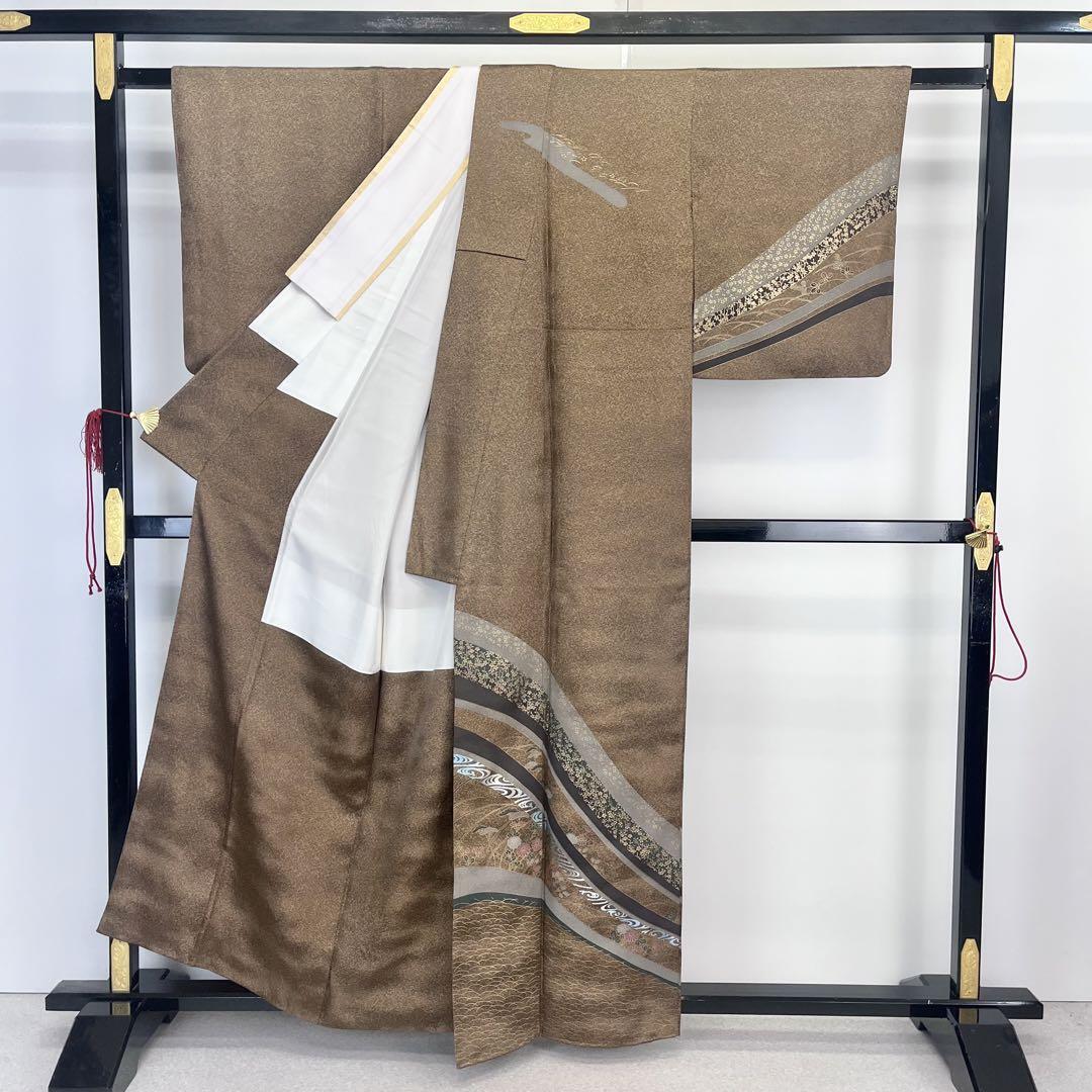 伽羅色の落ち着きのあるお色味に地模様、叩き染、金彩が使われた曲線に花模様がデザインされた素敵な柄裄のお品でございます。