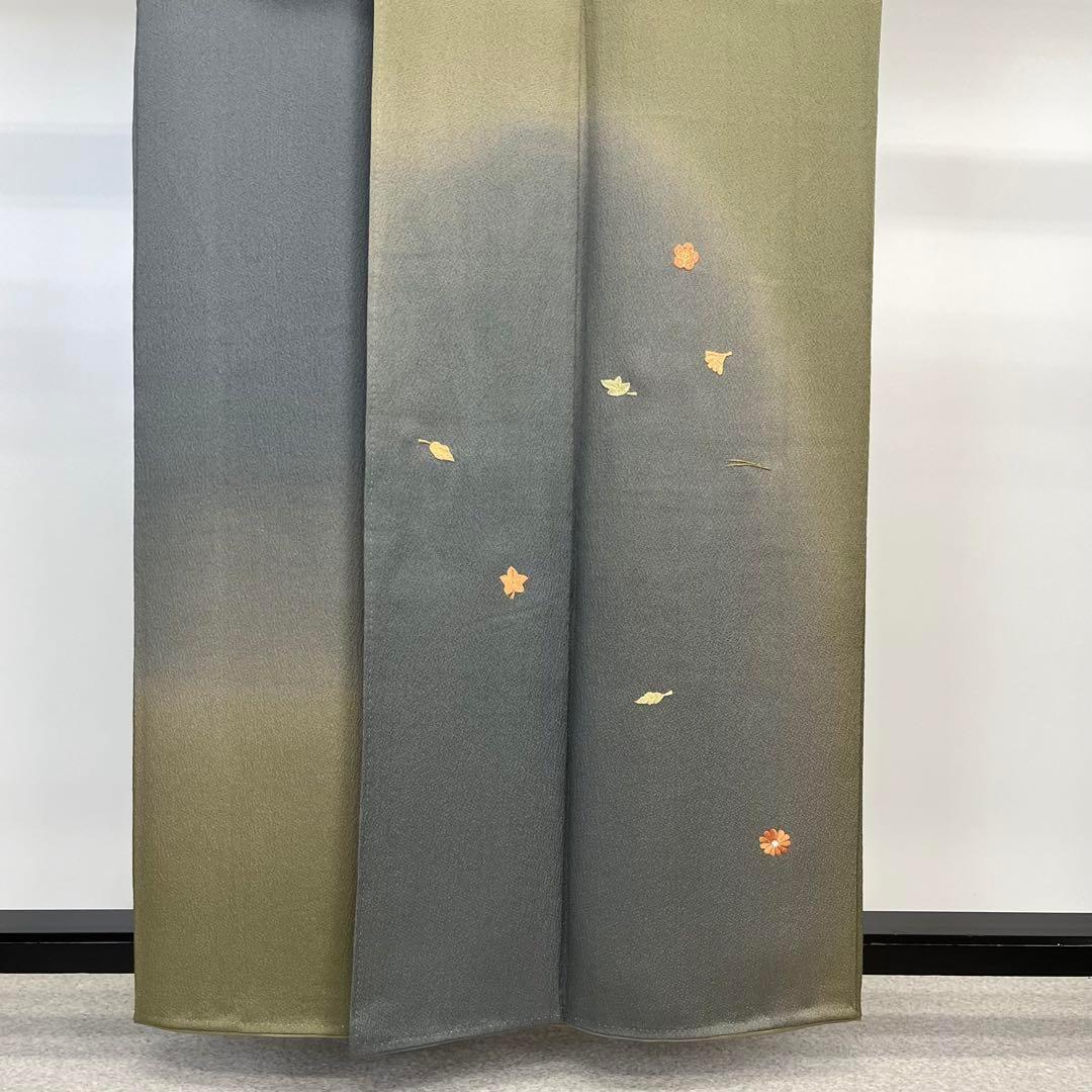 媚茶色の落ち着きのあるお色味に暈し、刺繍の花草柄がデザインされた素敵な柄裄のお品でございます。