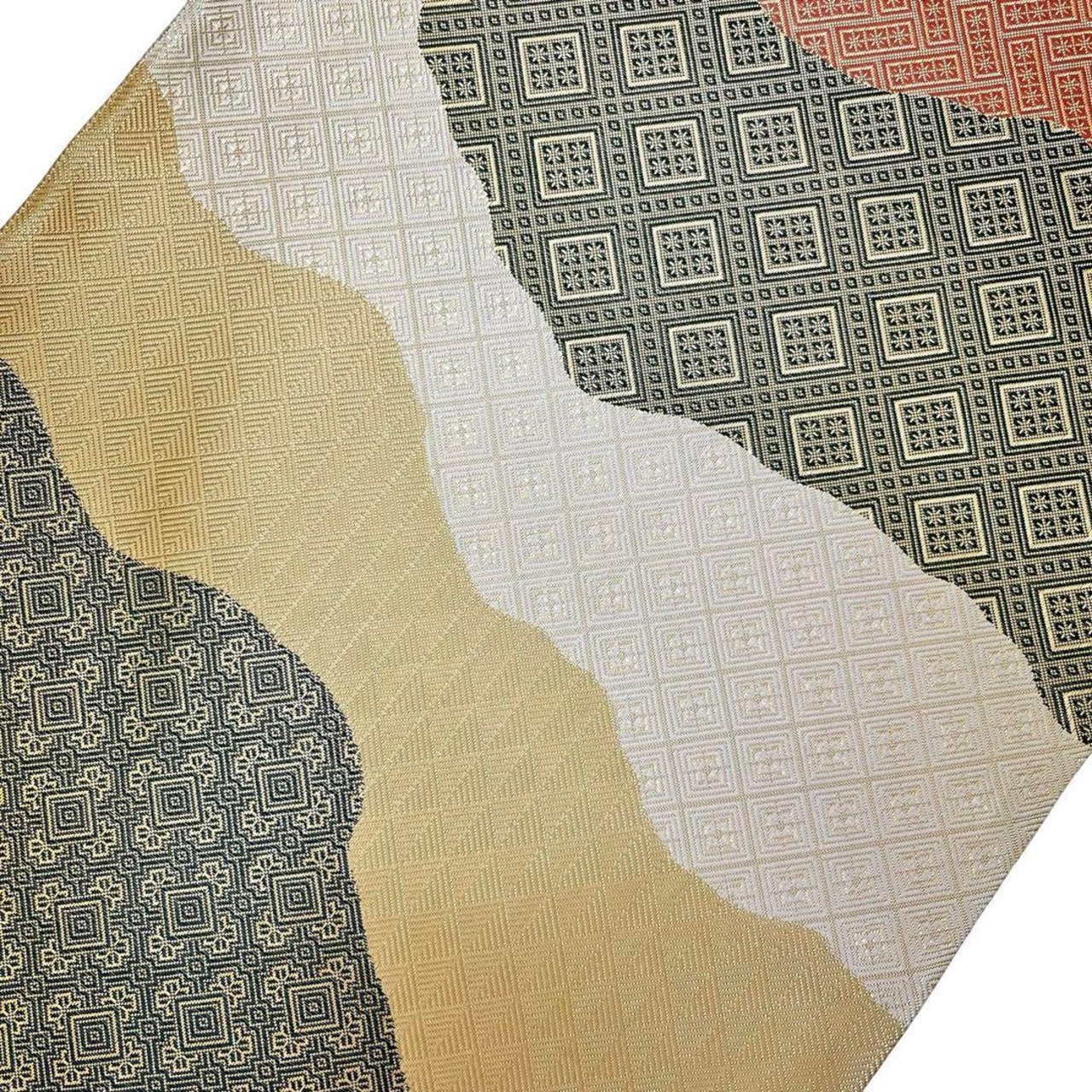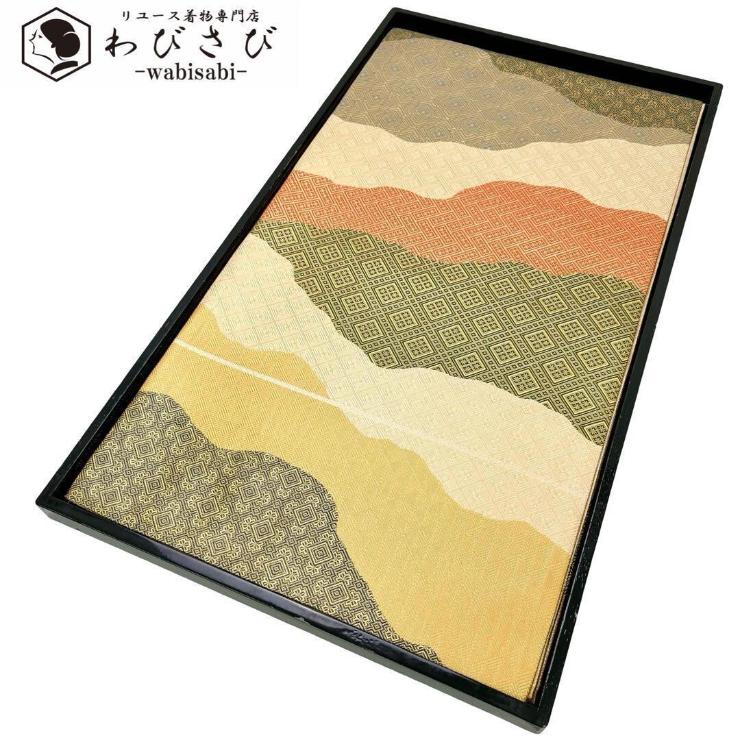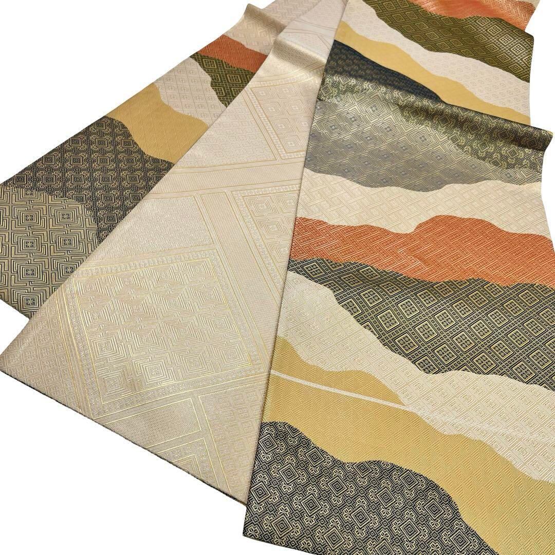 金色ベースの煌びやかなお色味に多様な織模様がデザインされた雲取りの素敵なお品でございます。