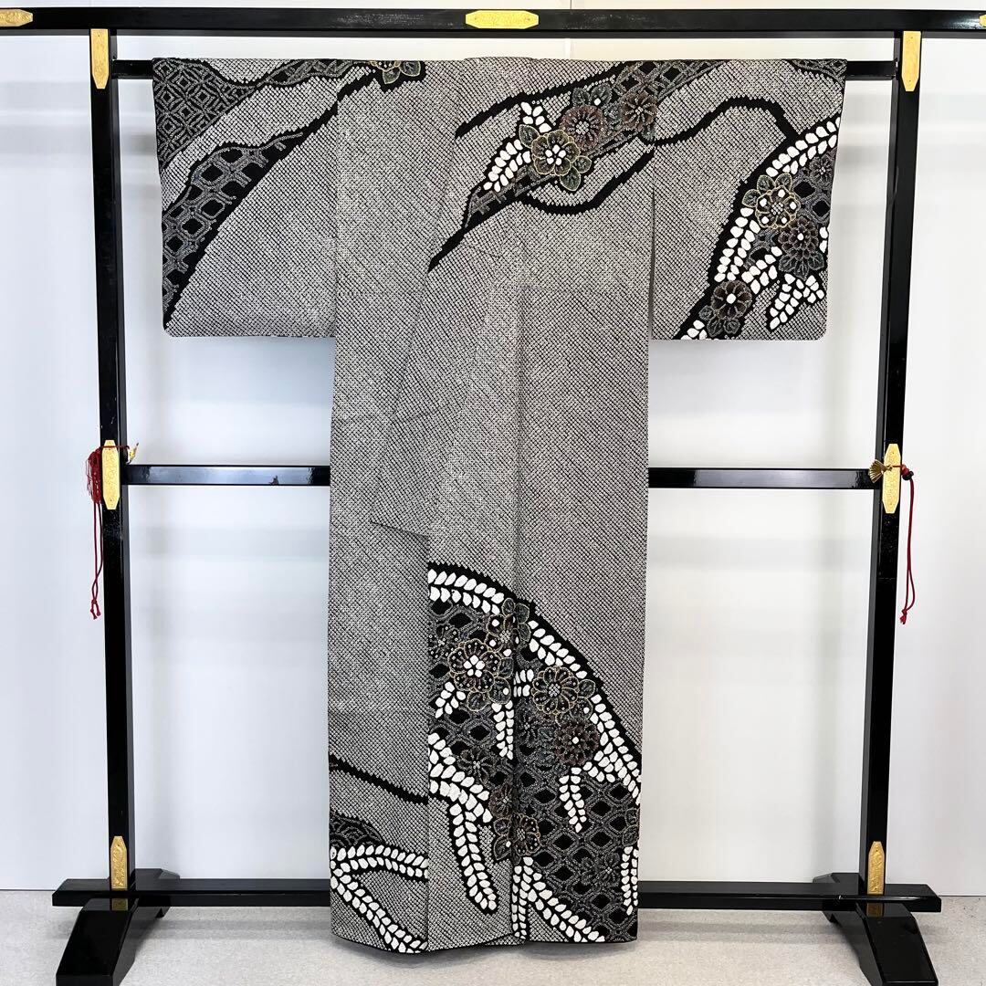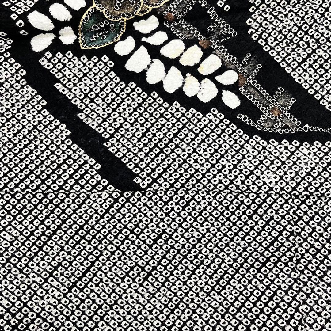 黒色ベースの総絞り、絞りに暈しの色彩が美しい辻が花の柄裄がデザインされた素敵なお品でございます。