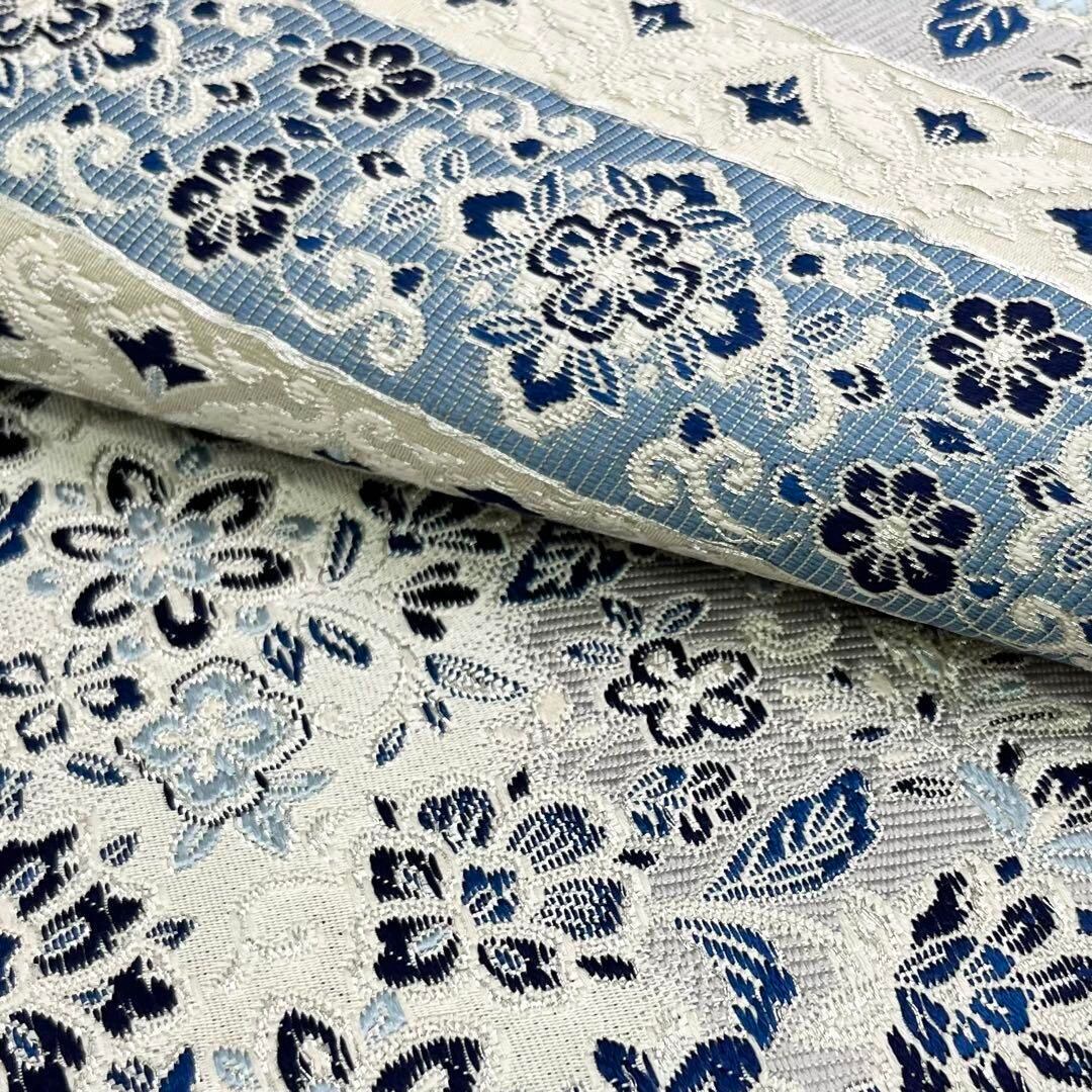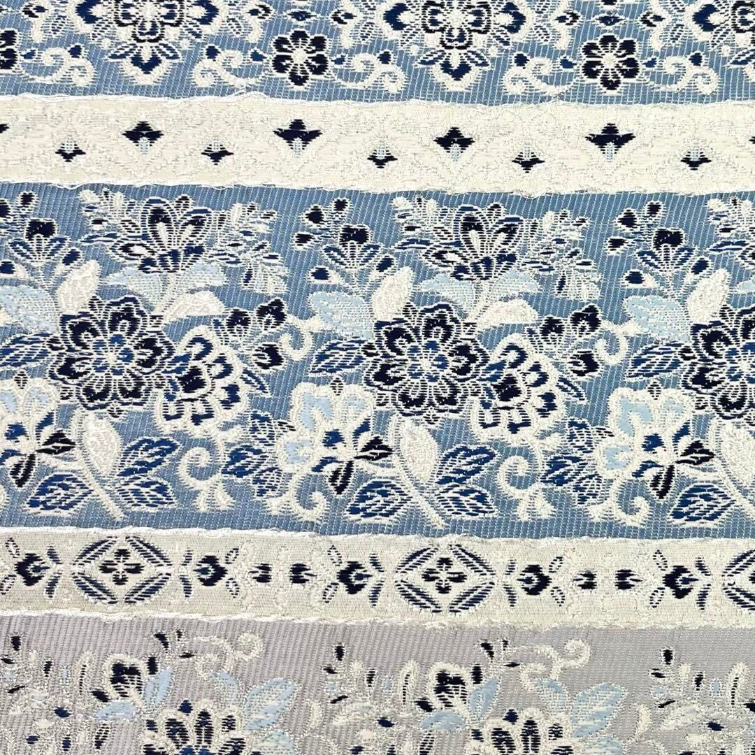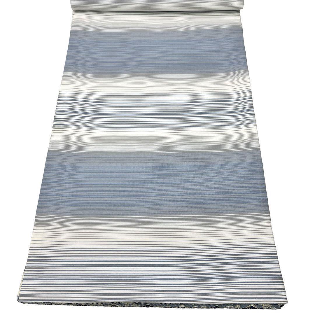 乳白色の品のあるお色に藍色の美しい色彩、横柄でデザインされた花柄模様の雰囲気が良い素敵な柄裄のお品でございます。