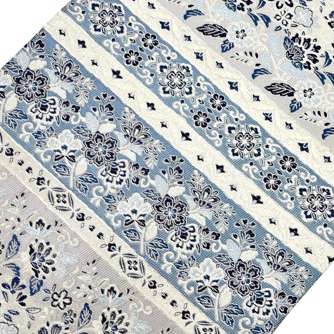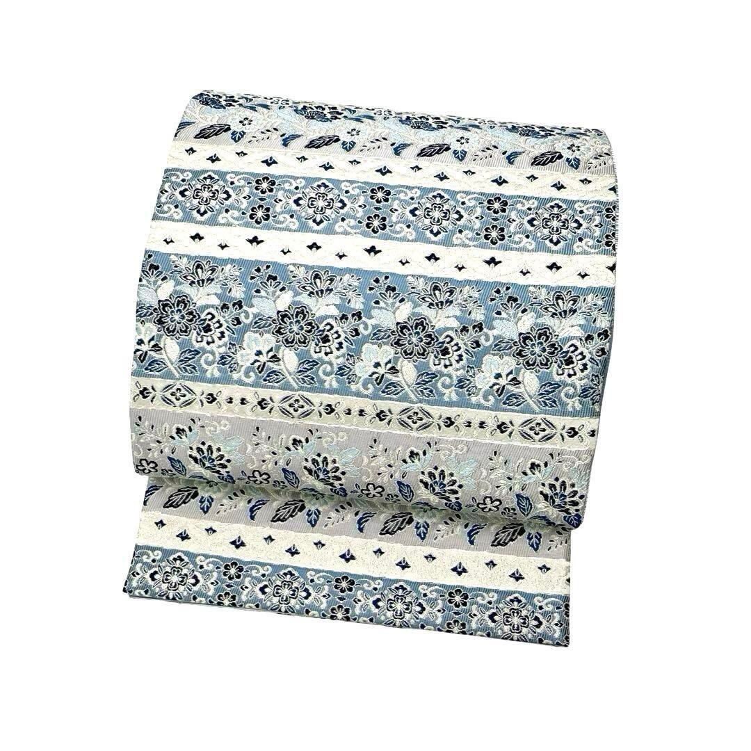 袋帯 藍染 美しい横段花模様 乳白色 銀糸 O-4212