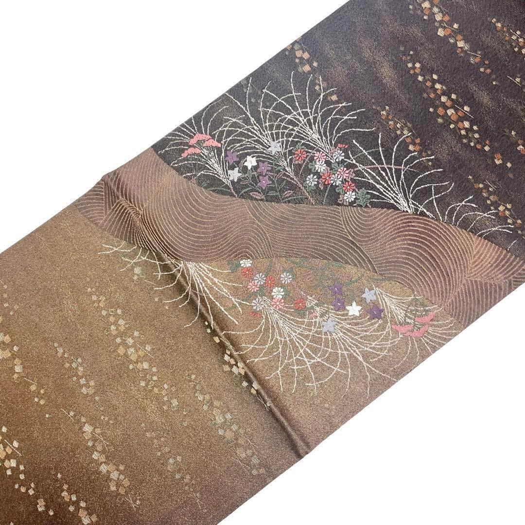 満月光と題された唐茶色ベースの落ち着きのあるお色味に花草模様、流水柄がデザインされた素敵な柄裄のお品でございます。