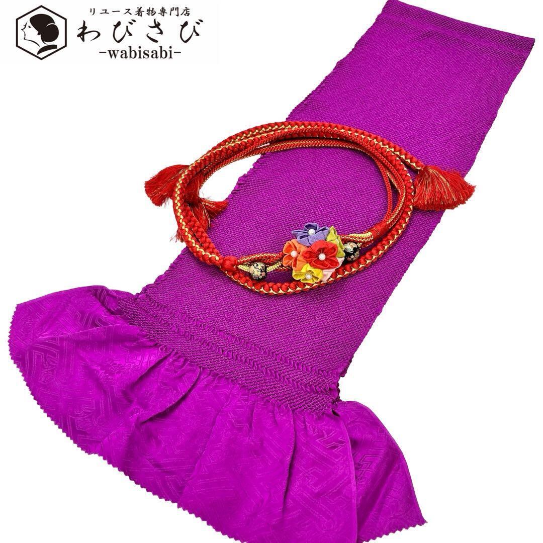 鮮やかな紫色ベースの総絞りの帯揚げ、カラフルな花柄の飾り付の帯締めのセットのお品でございます。