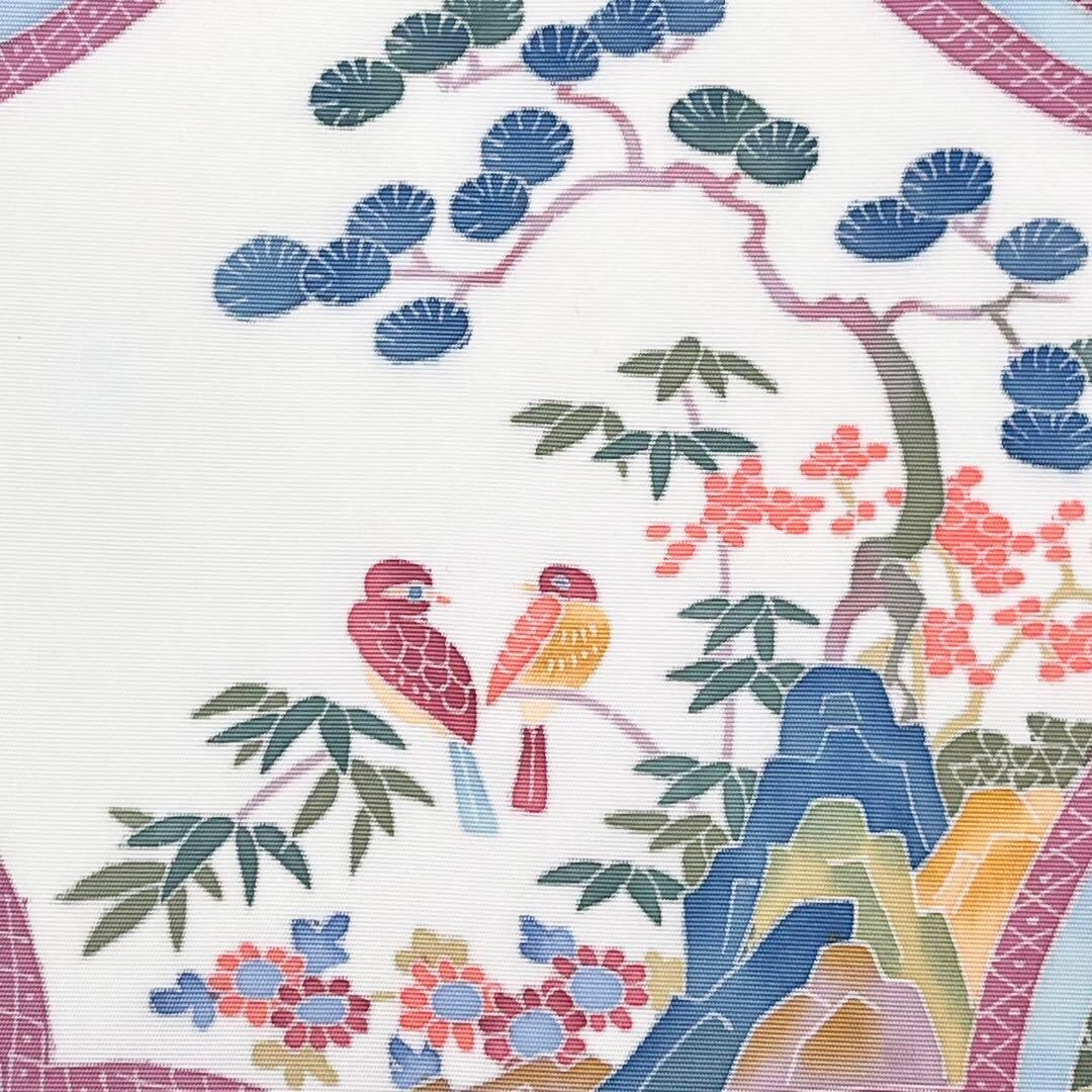 名古屋帯 本加賀友禅 押田正義 塩瀬 丸に松笹鳥柄 薄卵色 O-4243