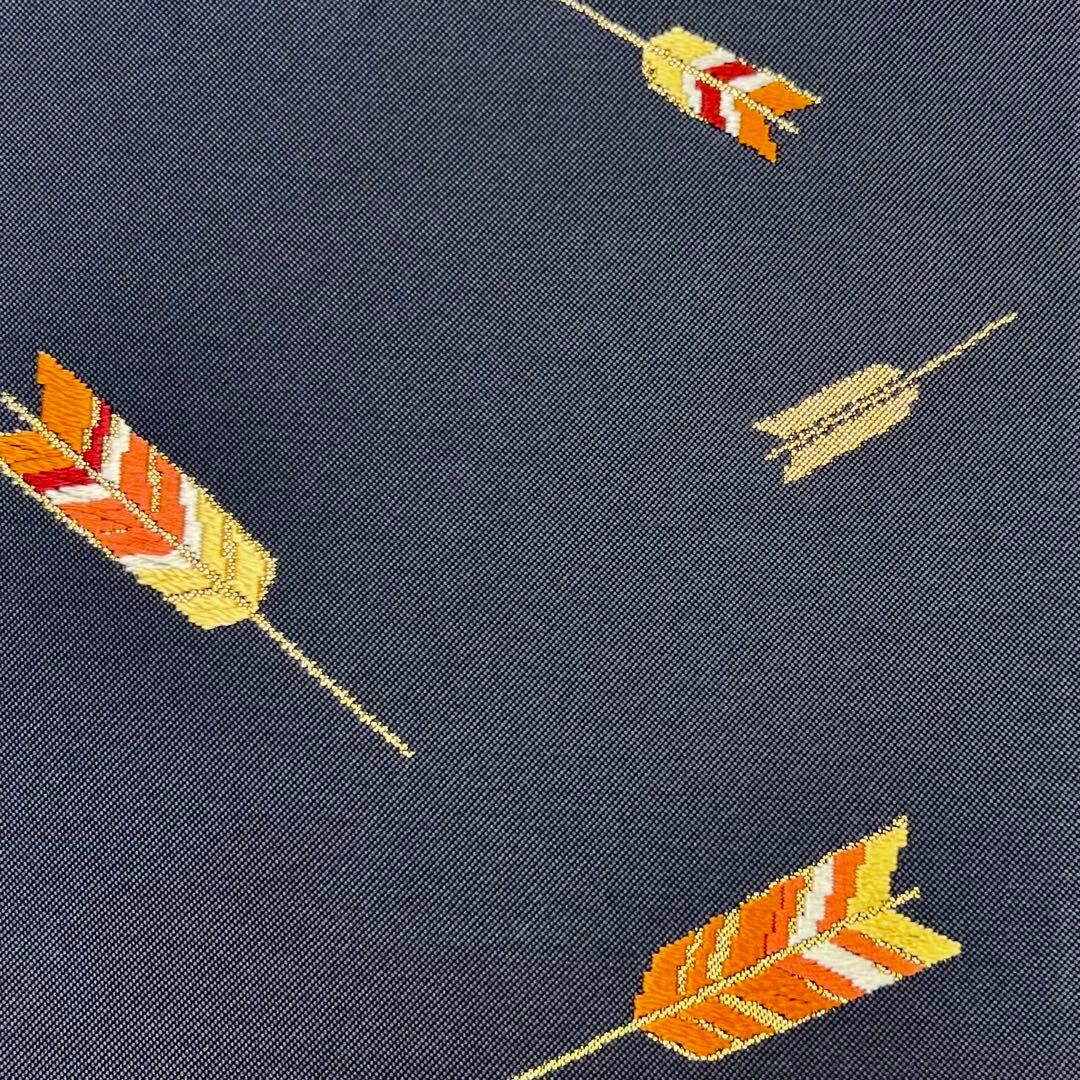錆鼠色の落ち着いたお色味に矢羽の刺繍柄がデザインされた素敵な柄裄のお品でございます。