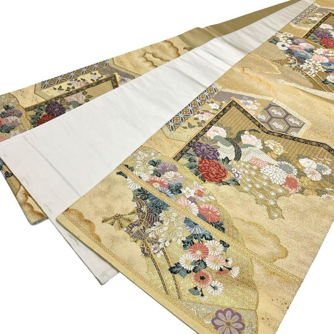 金色ベースのお色味に色鮮やかな美しい花模様に鳥がデザインされた素敵な柄裄のお品でございます。