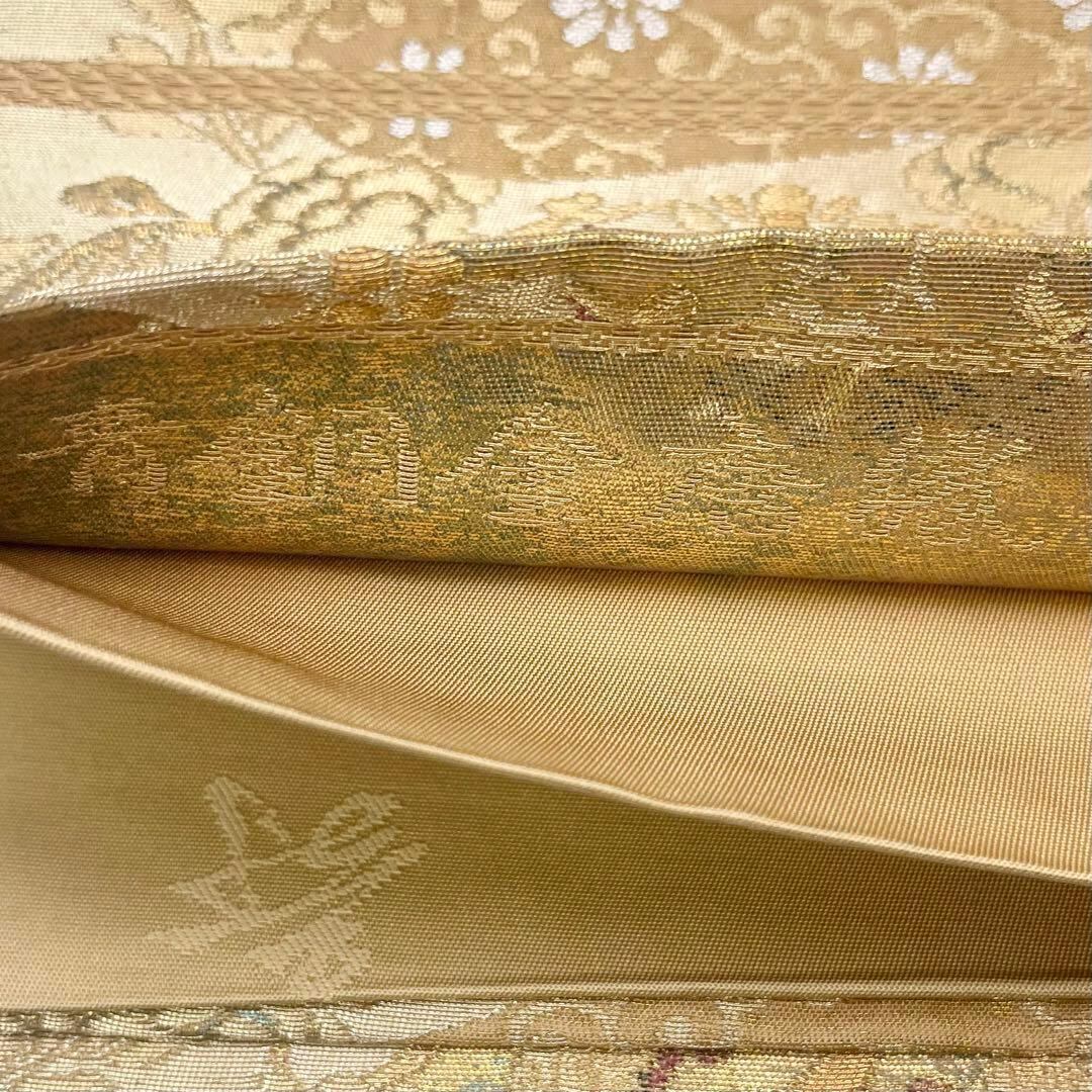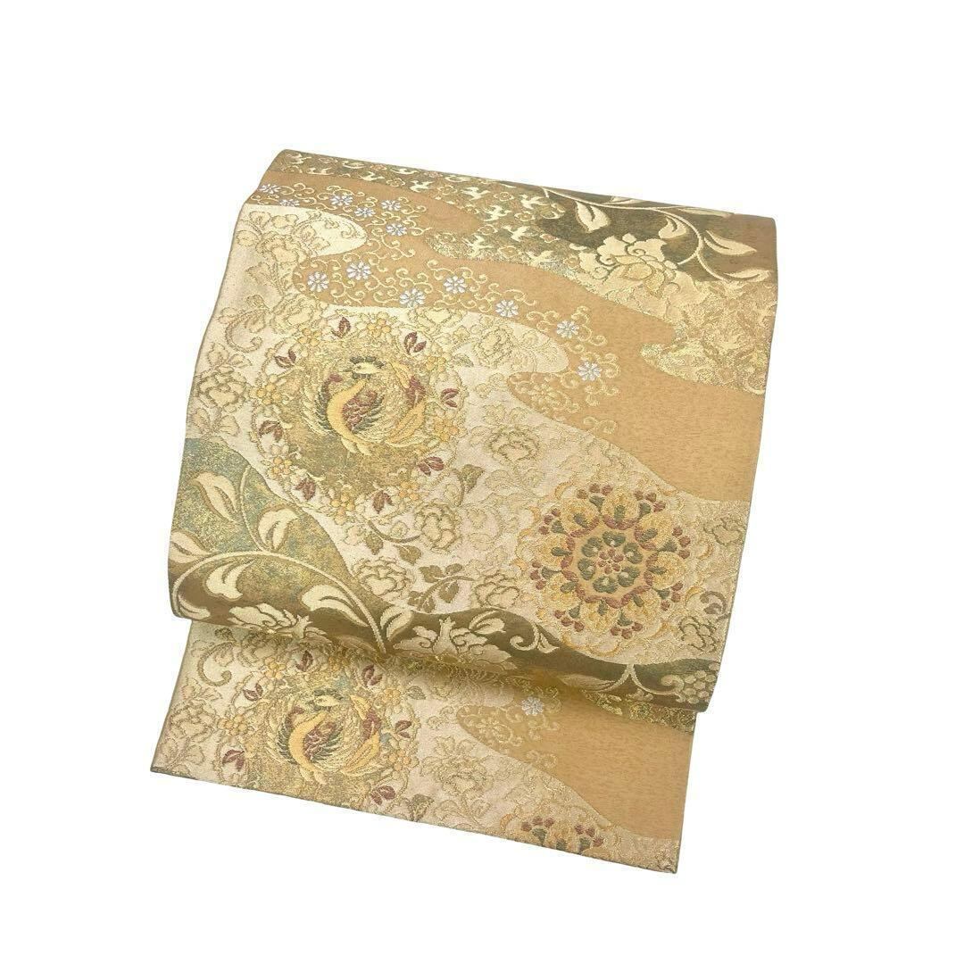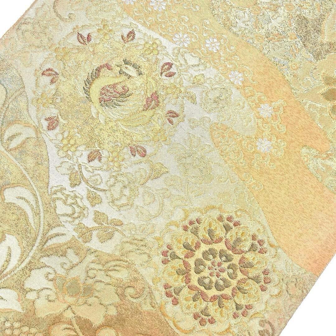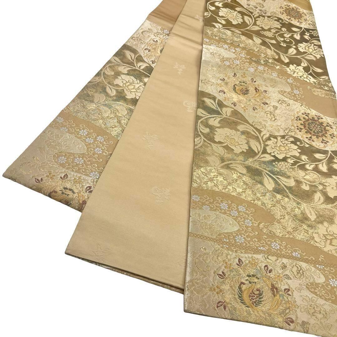 青銅金唐織、引箔と題された麦藁色ベースの美しい華柄模様、花唐草の柄裄がデザインされた素敵なお品でございます。