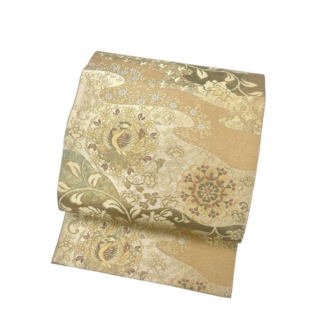 袋帯 青銅金唐織 引箔 美しい華柄模様 花唐草 金通し 麦藁色 O-4244 着物 きもの kimono 和服 和装 中古 リサイクル着物 【送料無料】