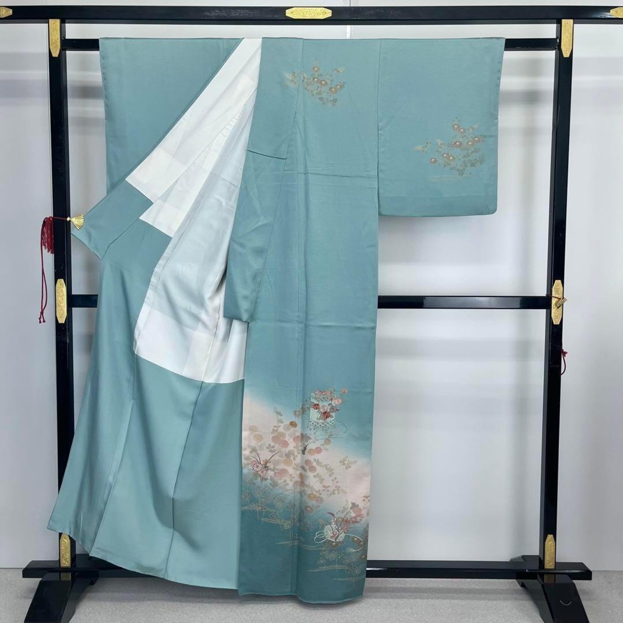 訪問着 刺繍柄 上品な花模様 貝桶 金彩 暈し 錆青磁色 K-4086 着物 きもの kimono 和服 和装 中古 リサイクル着物 【送料無料】