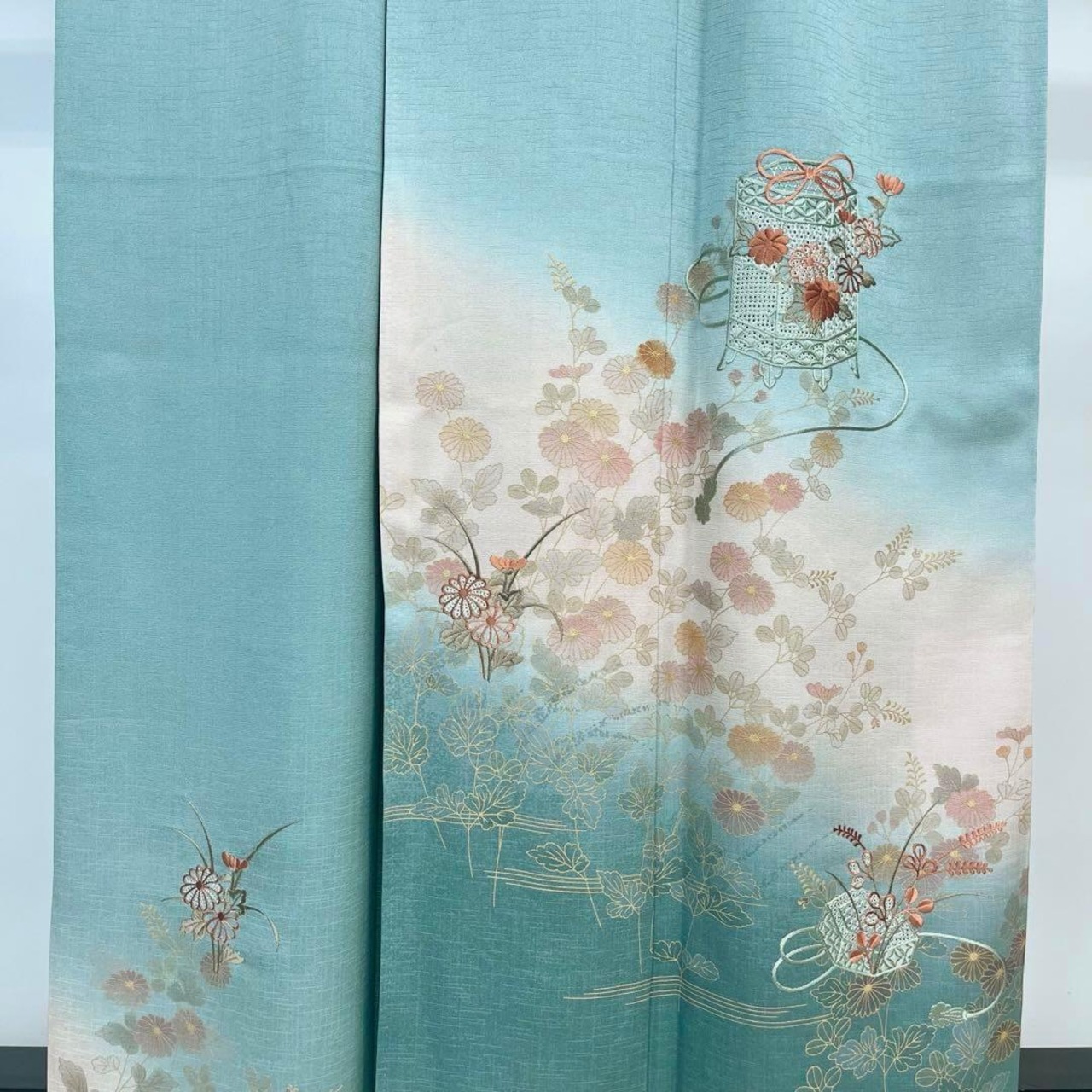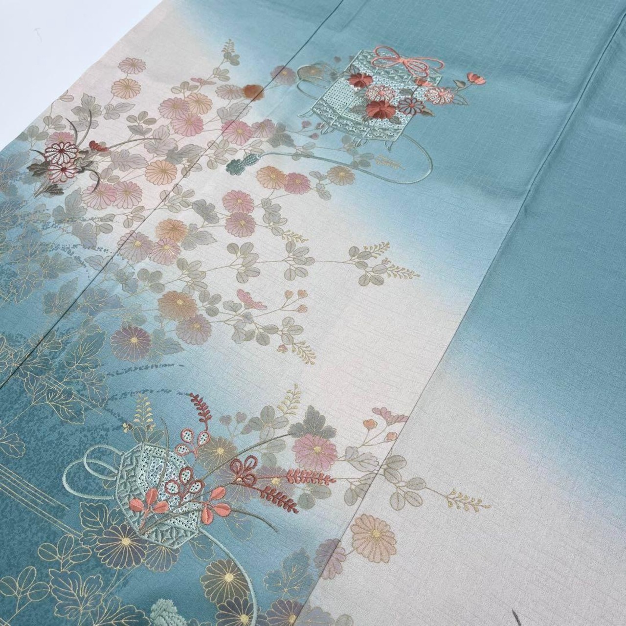 錆青磁色ベースのお色味に暈し、刺繍の貝桶、花模様がデザインされた品のある素敵な柄裄のお品でございます。