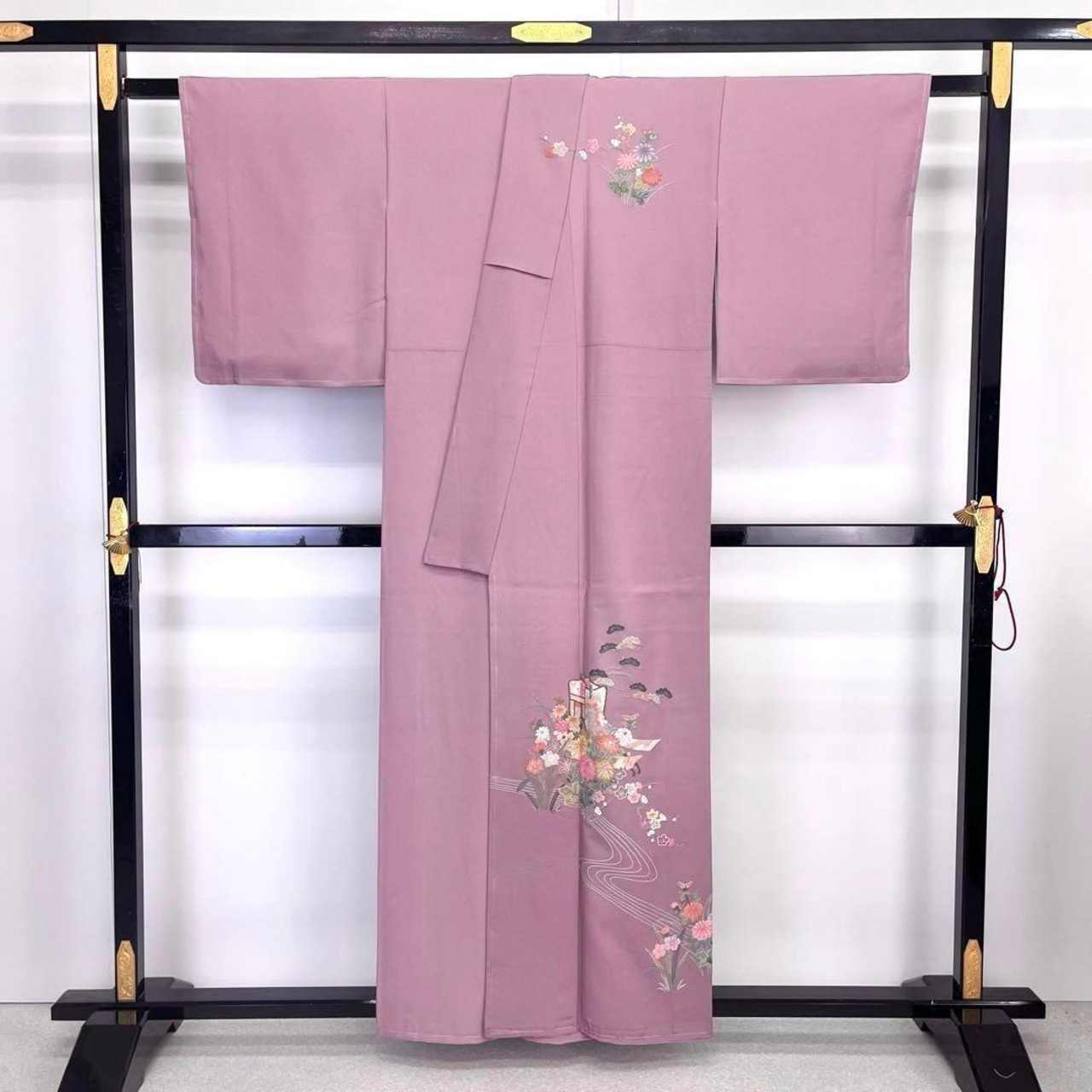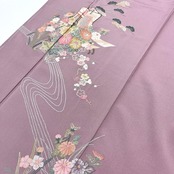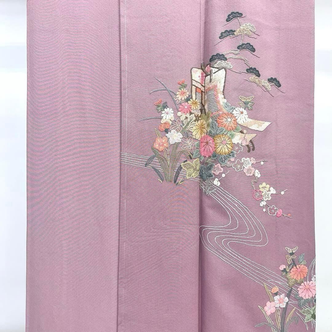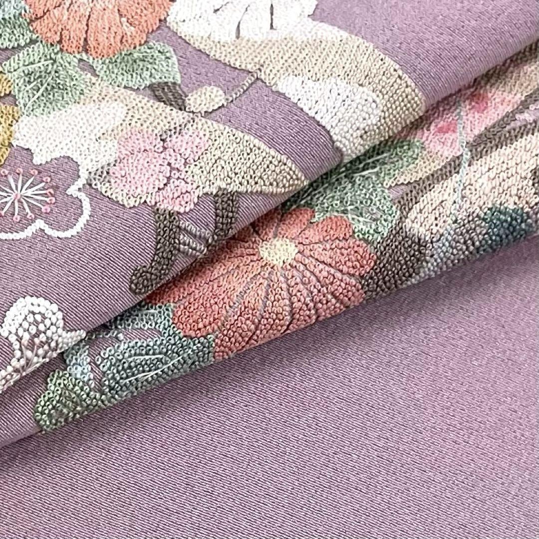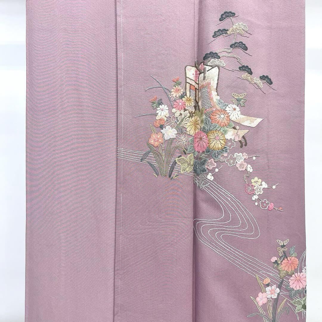 積紅色の縮緬に総相良刺繍でデザインされた御所車に花模様、松の柄裄の素敵なお品でございます。