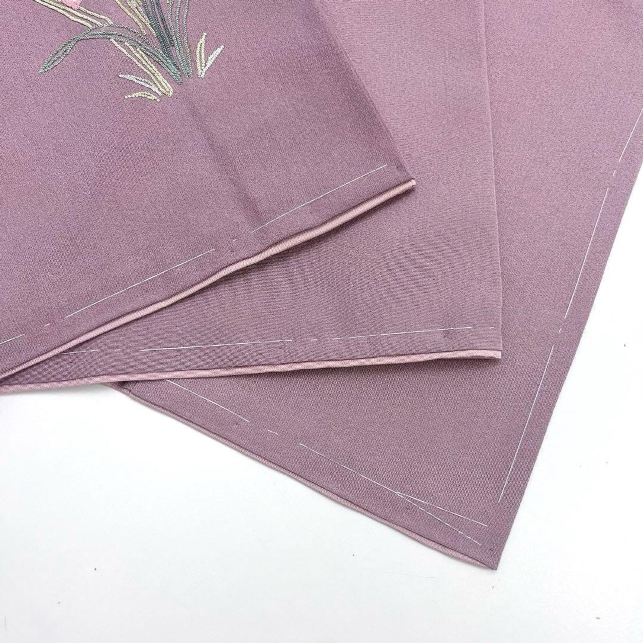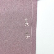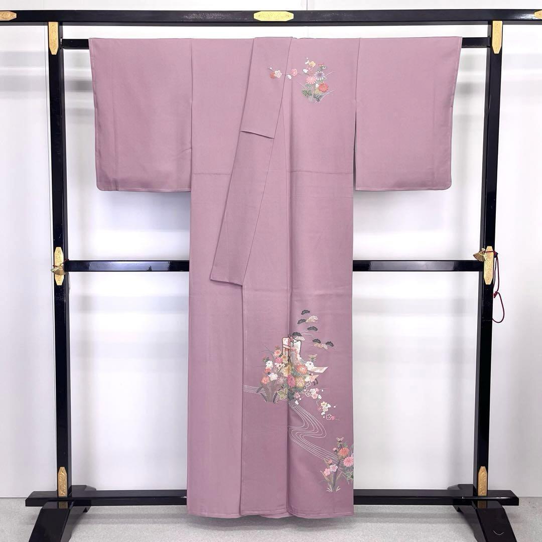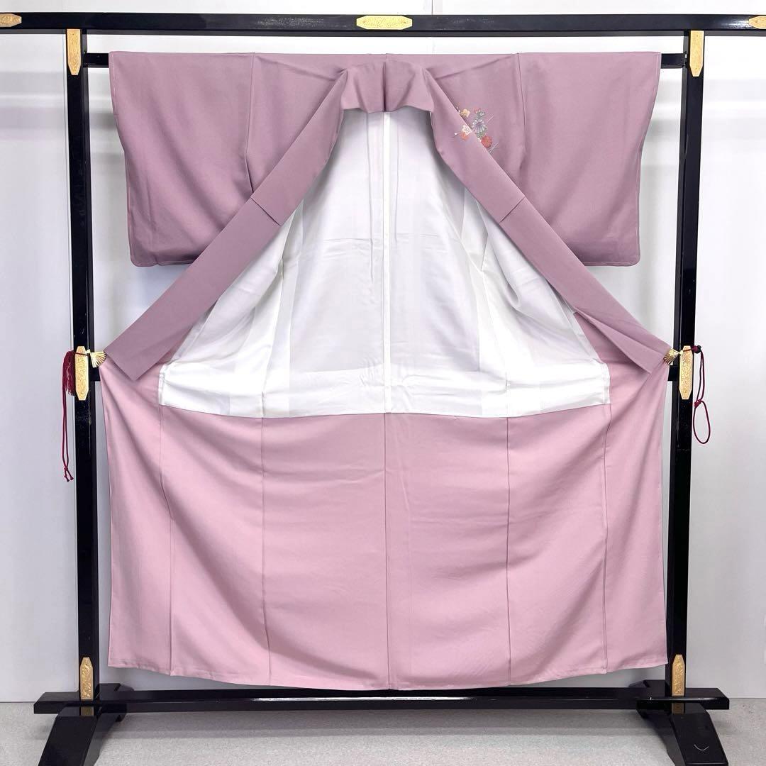 積紅色の縮緬に総相良刺繍でデザインされた御所車に花模様、松の柄裄の素敵なお品でございます。