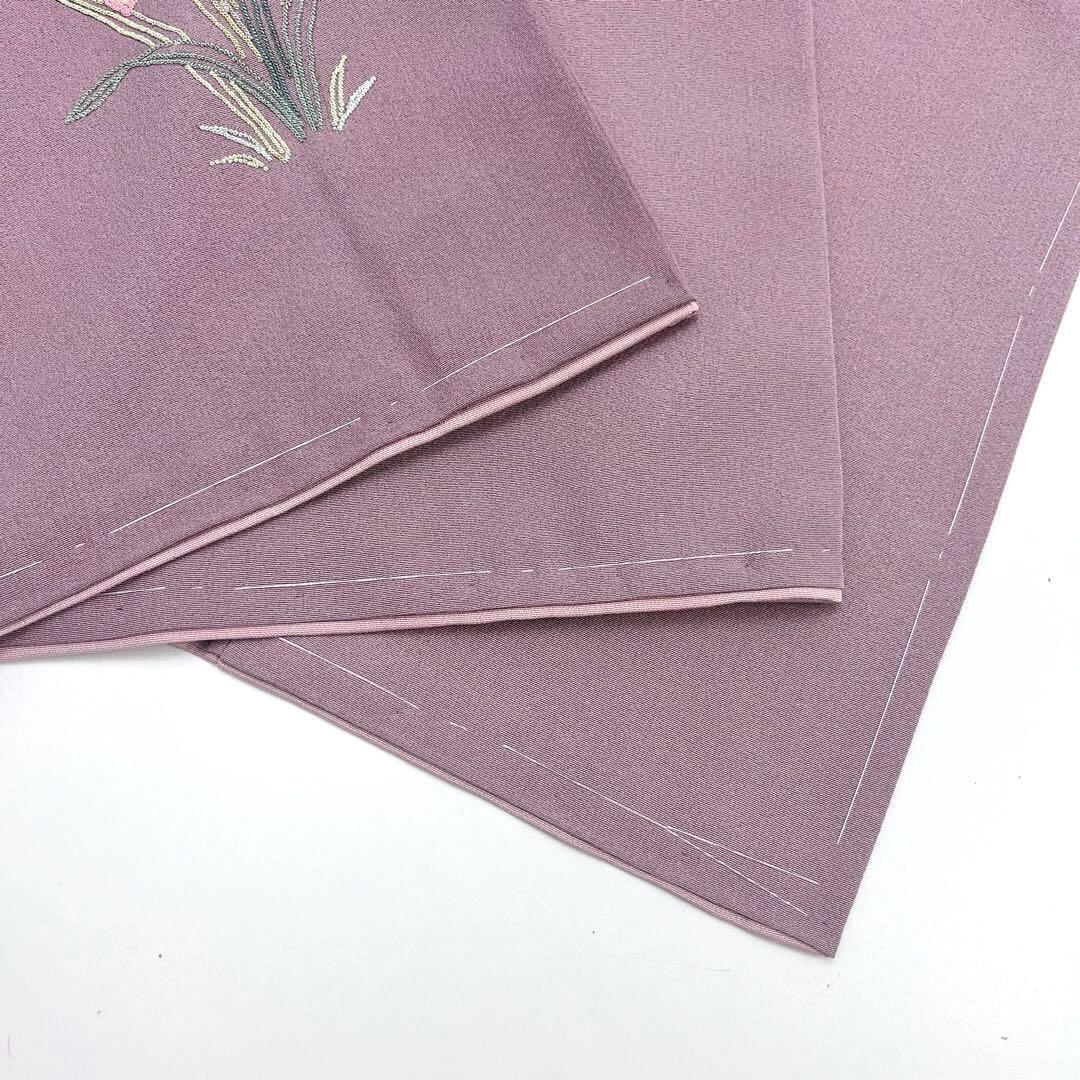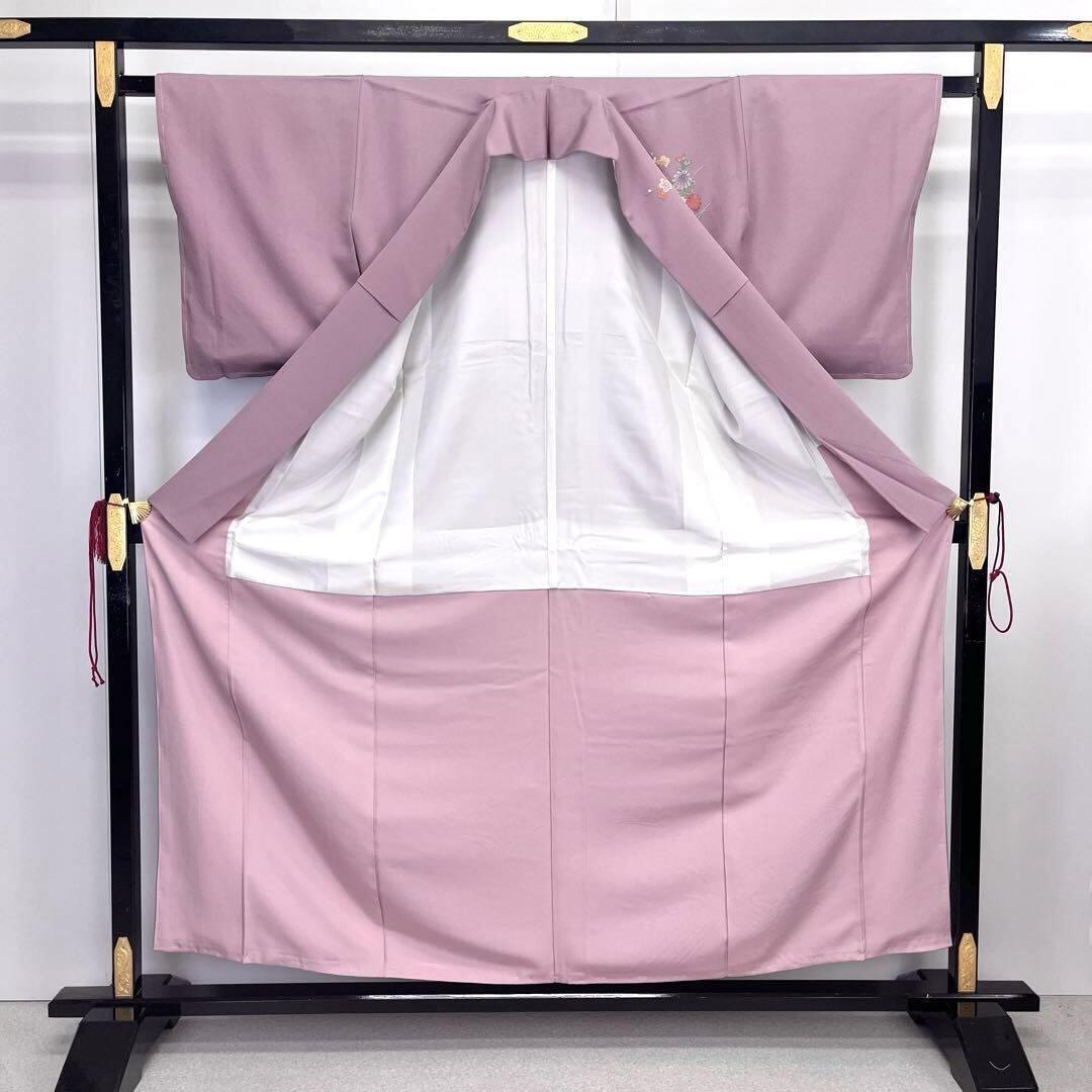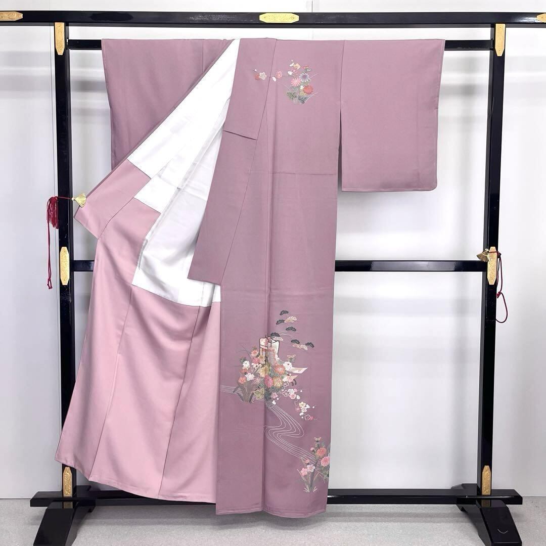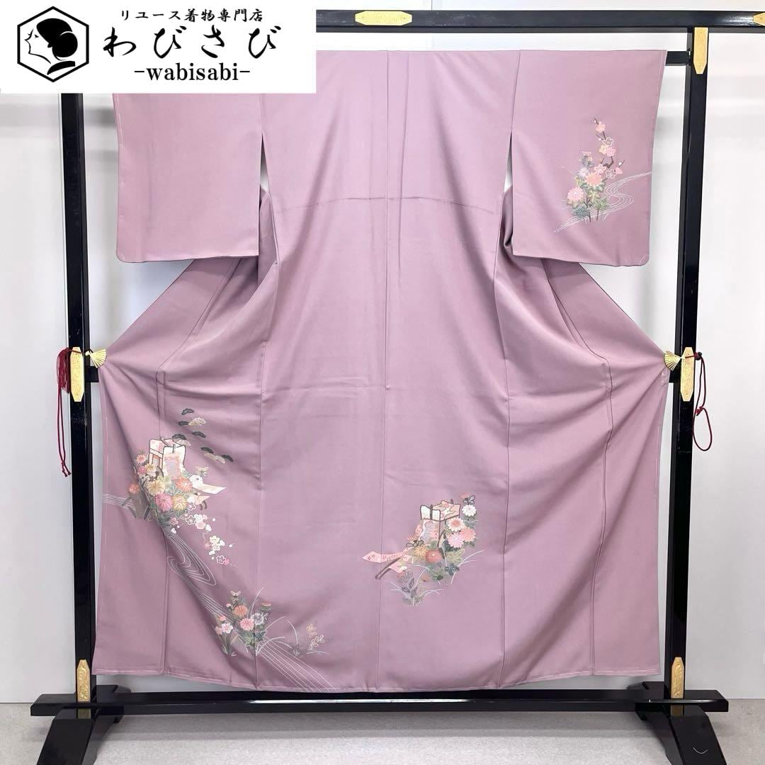 付下げ 総相良刺繍 御所車に花模様 松 積紅色 縮緬 しつけ糸 K-4088 着物 きもの kimono 和服 和装 中古 リサイクル着物 【送料無料】