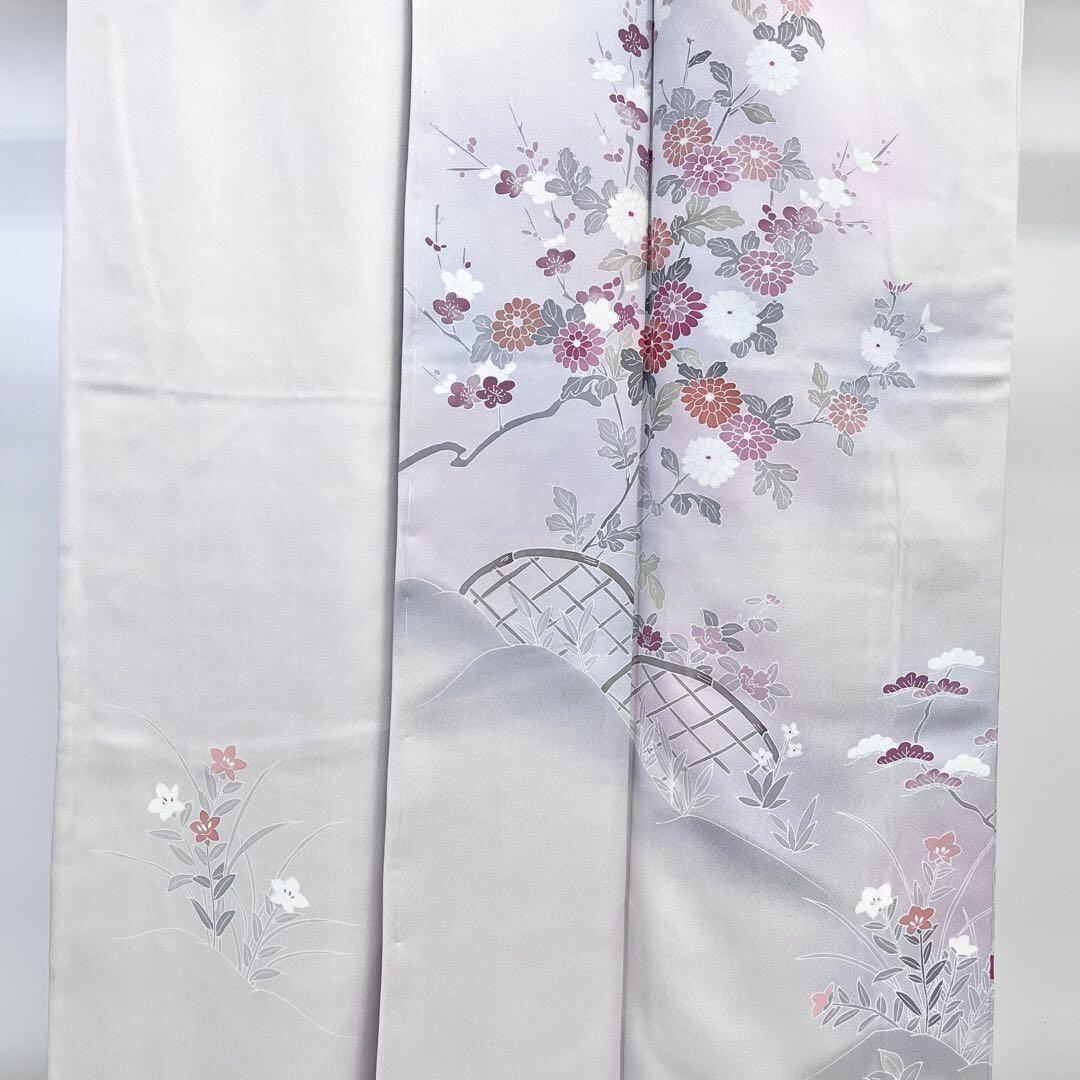 白梅鼠色の淡いお色味に暈し、上品な花模様がデザインされた素敵な柄裄のお品でございます。