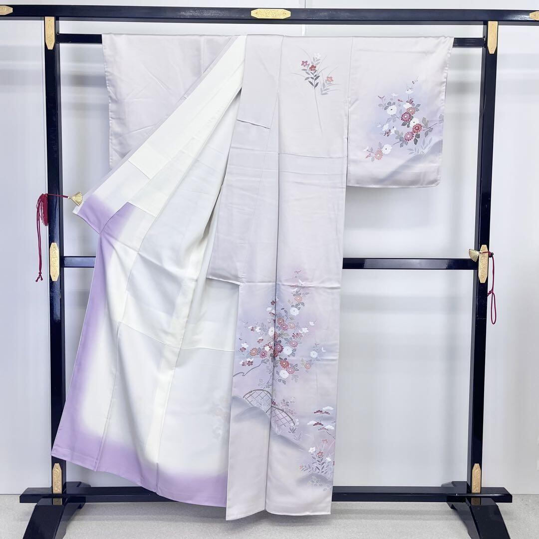 付下げ 上品な花模様 暈し 白梅鼠色 しつけ糸 K-4089 着物 きもの kimono 和服 和装 中古 リサイクル着物 【送料無料】