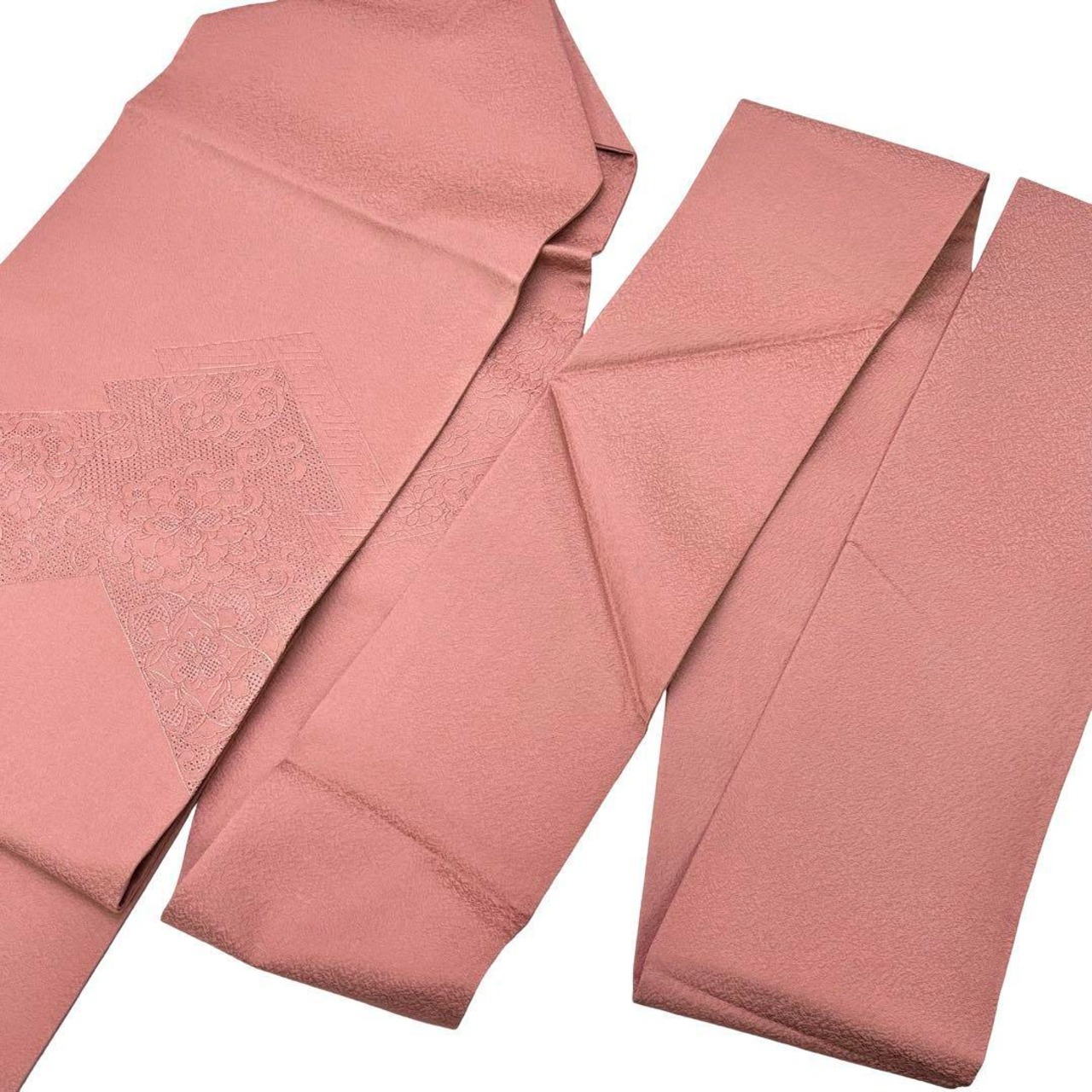 名古屋帯 汕頭刺繍 華柄模様 桃染色 縮緬 O-4275