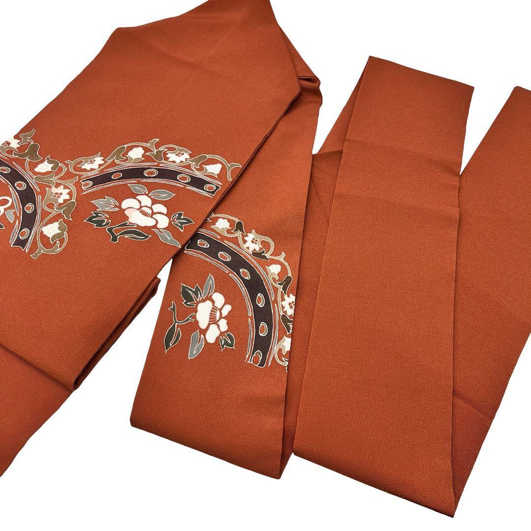 赭色の落ち着きのある赤味の縮緬に一部刺繍が使われた椿の花、花唐草模様がデザインされた雰囲気の良い素敵なお品でございます。