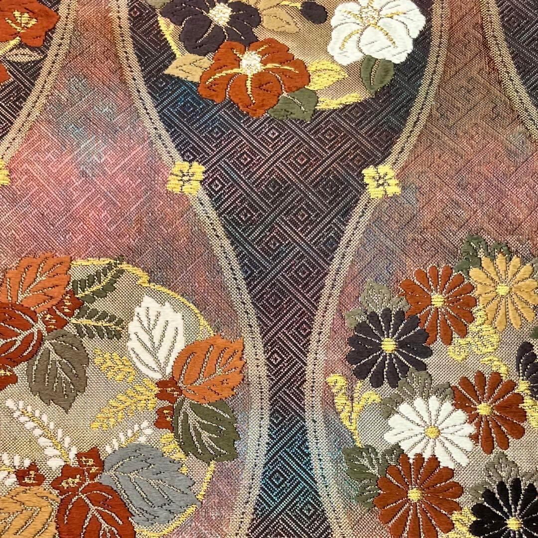 立涌に唐織の花模様、梅、菊、紅葉、椿の花などがデザインされた素敵な柄裄のお品でございます。
