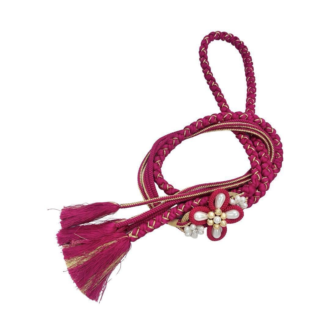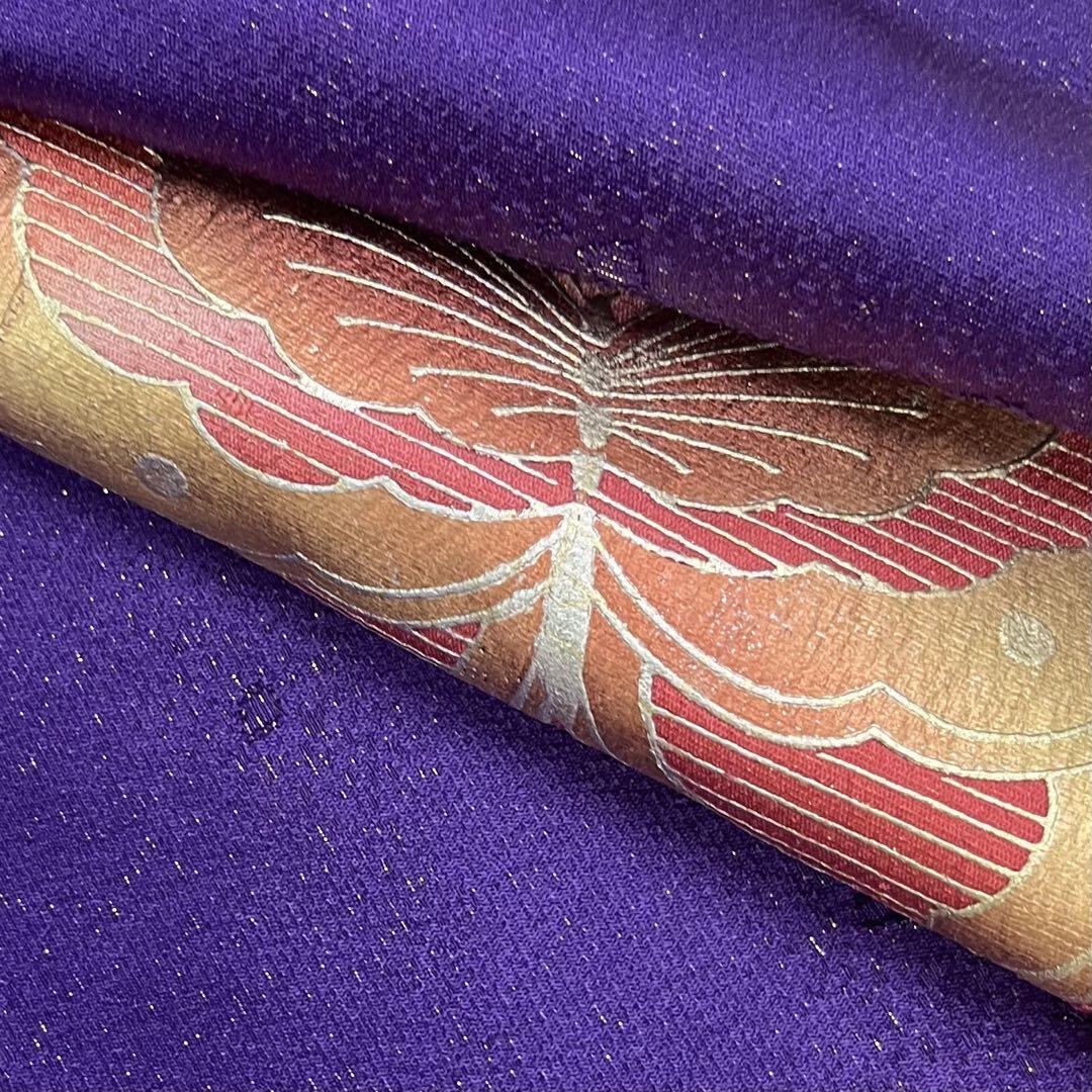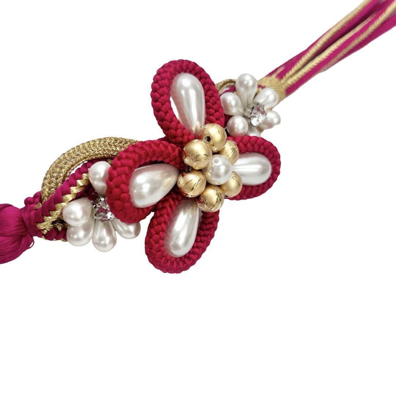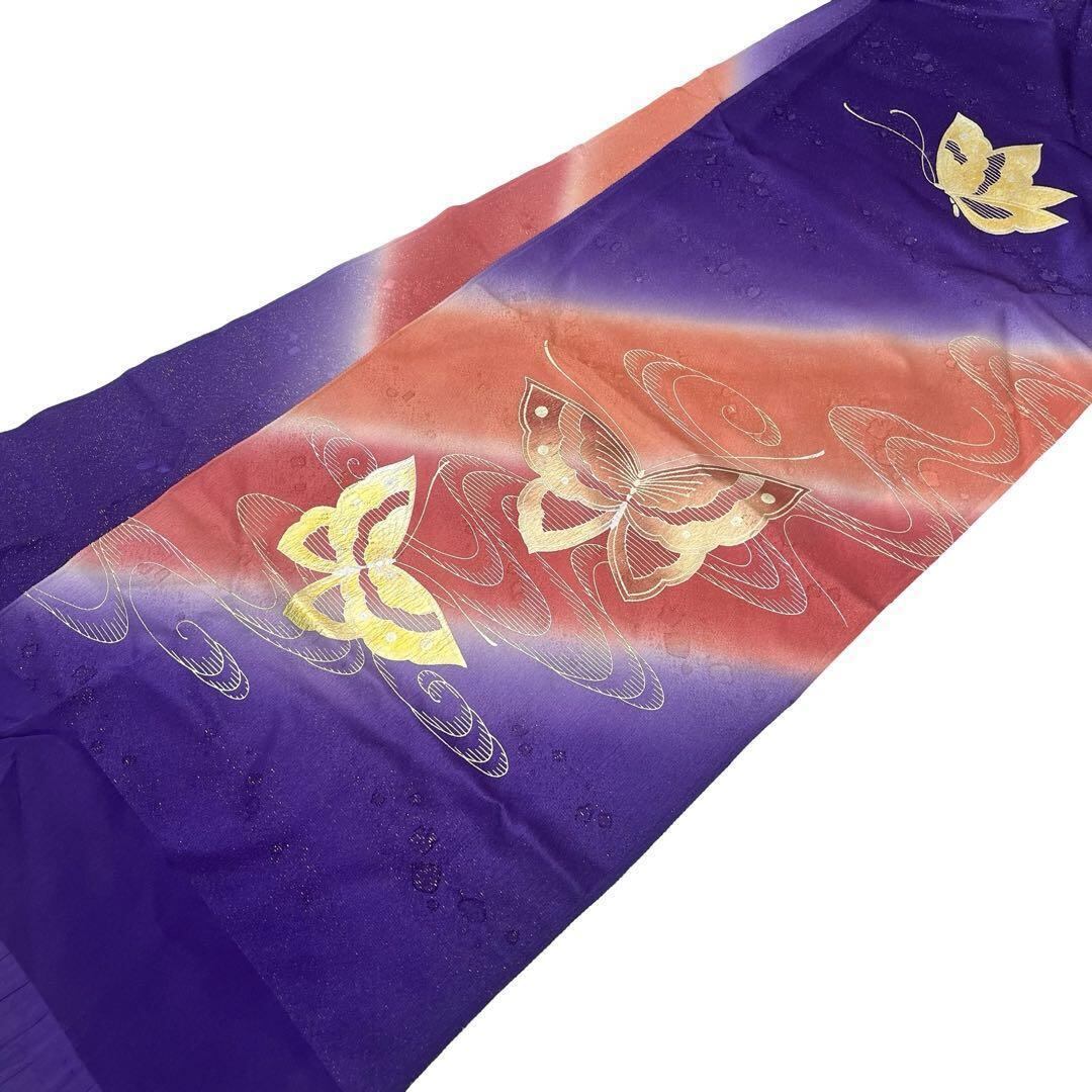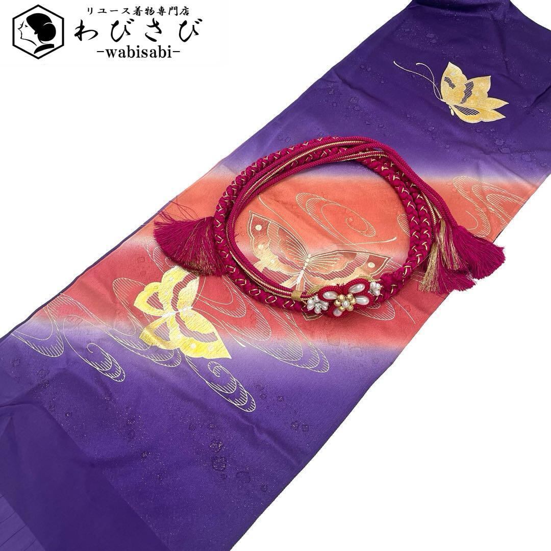 グラデーションに美しい金彩の蝶々柄の帯揚げ、パール調の可愛い花柄の飾り付きの帯締めのセットのお品でございます。