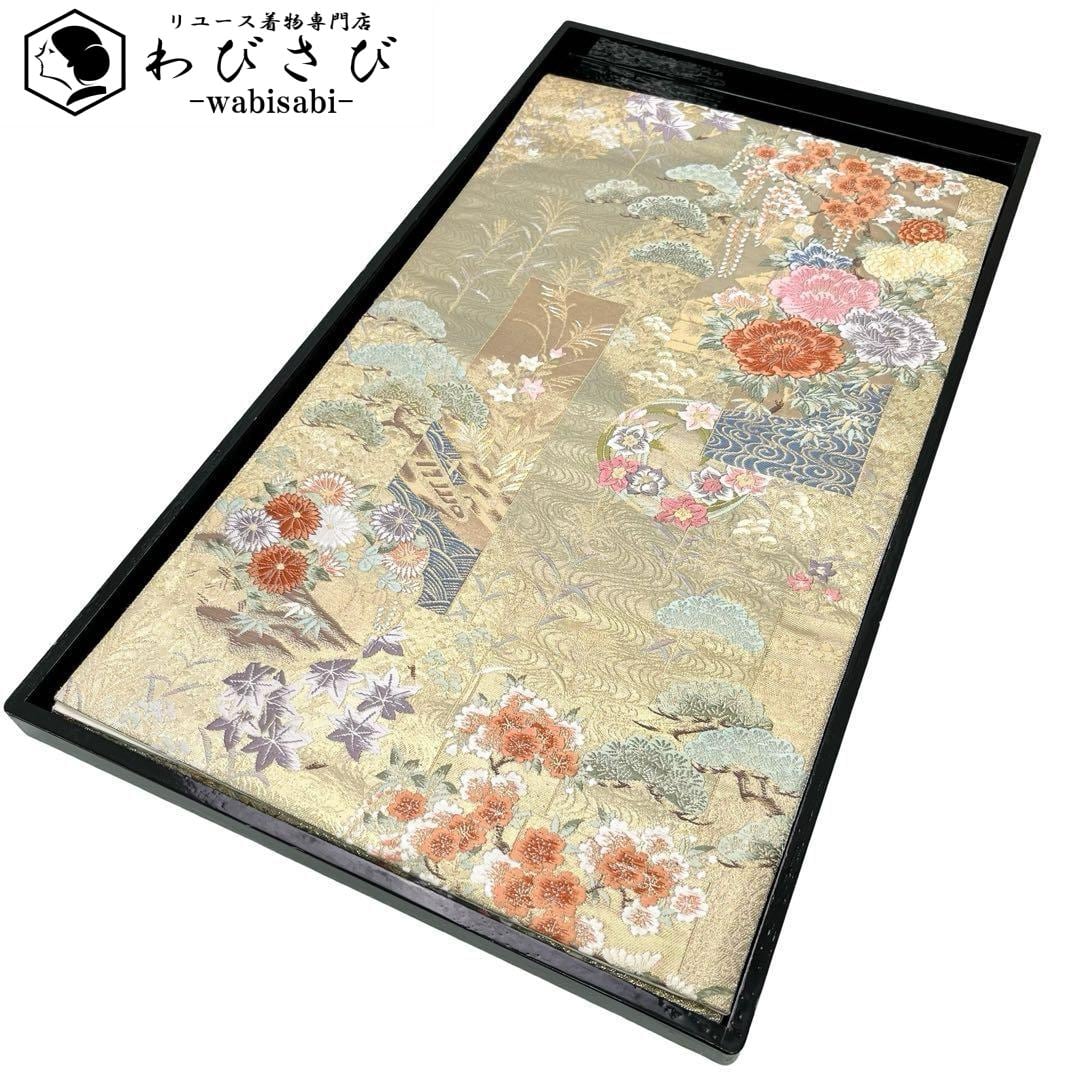 袋帯 美しい四季の花模様 金糸 金色 O-4295 着物 きもの kimono 和服 和装 中古 リサイクル着物 【送料無料】