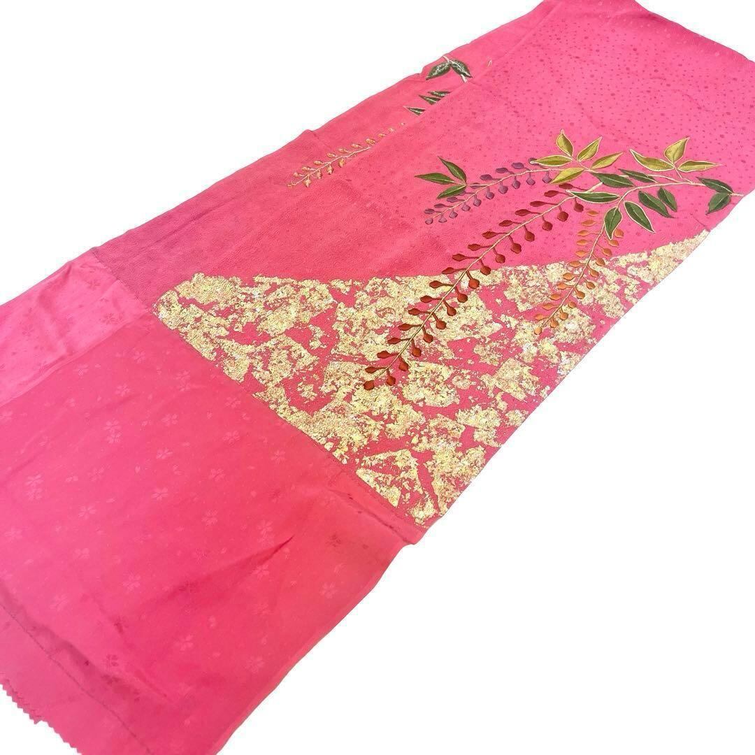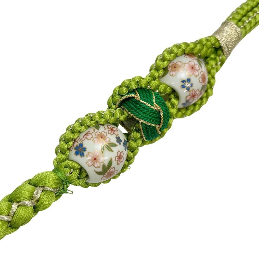 桃色ベースの金銀彩に刺繍の帯揚げ、黄緑色ベースに花柄模様の飾りが付いた帯締めのセットのお品でございます。
