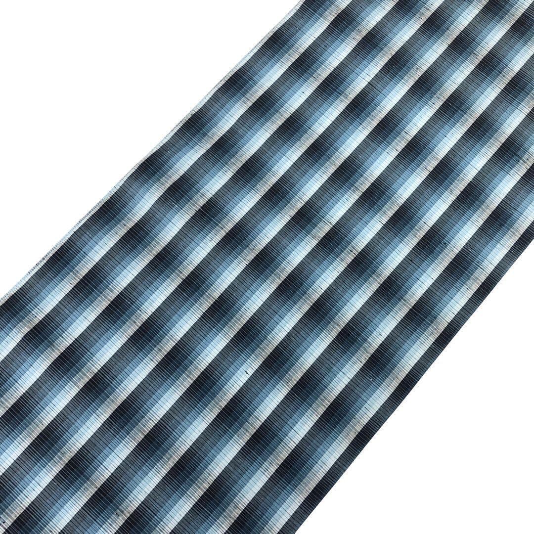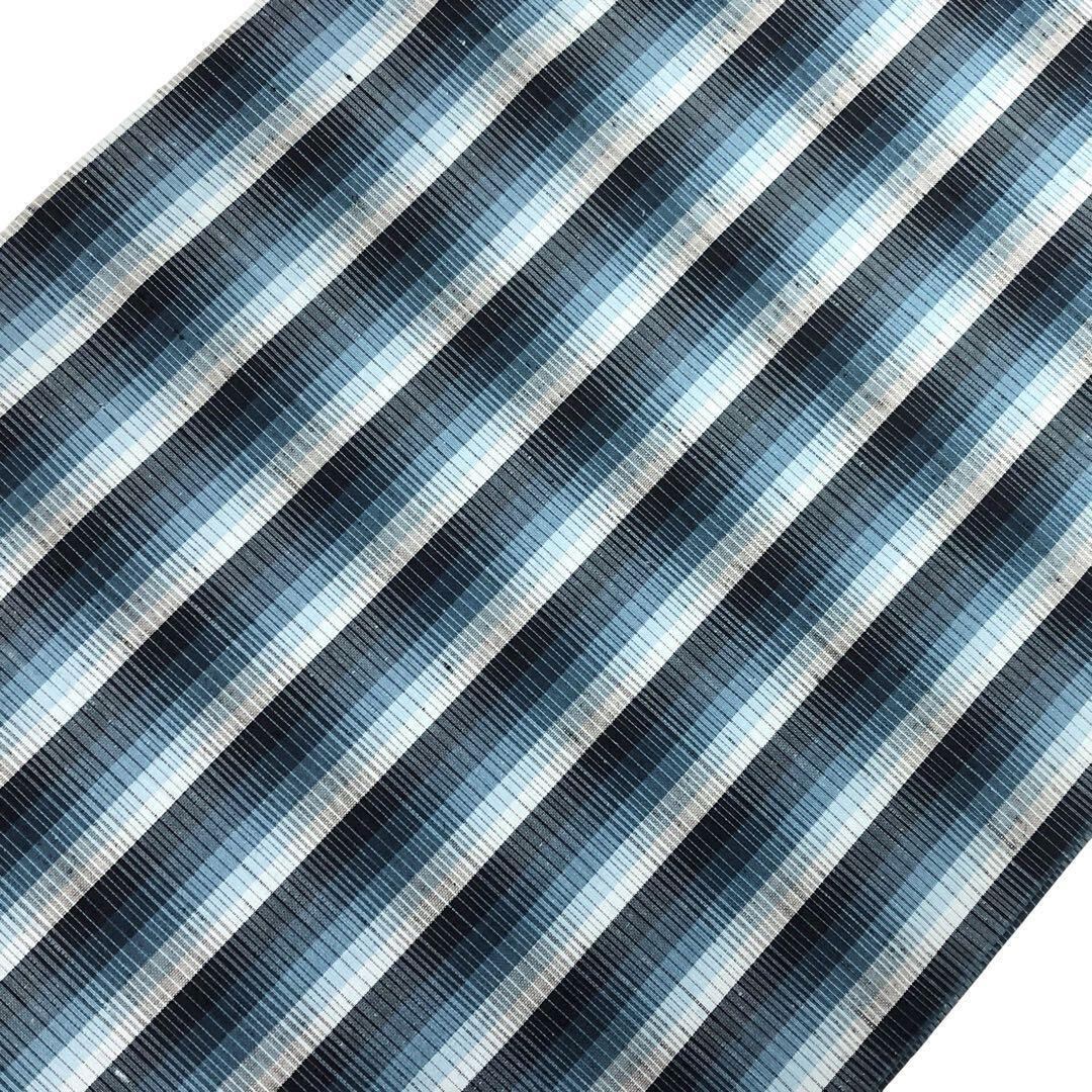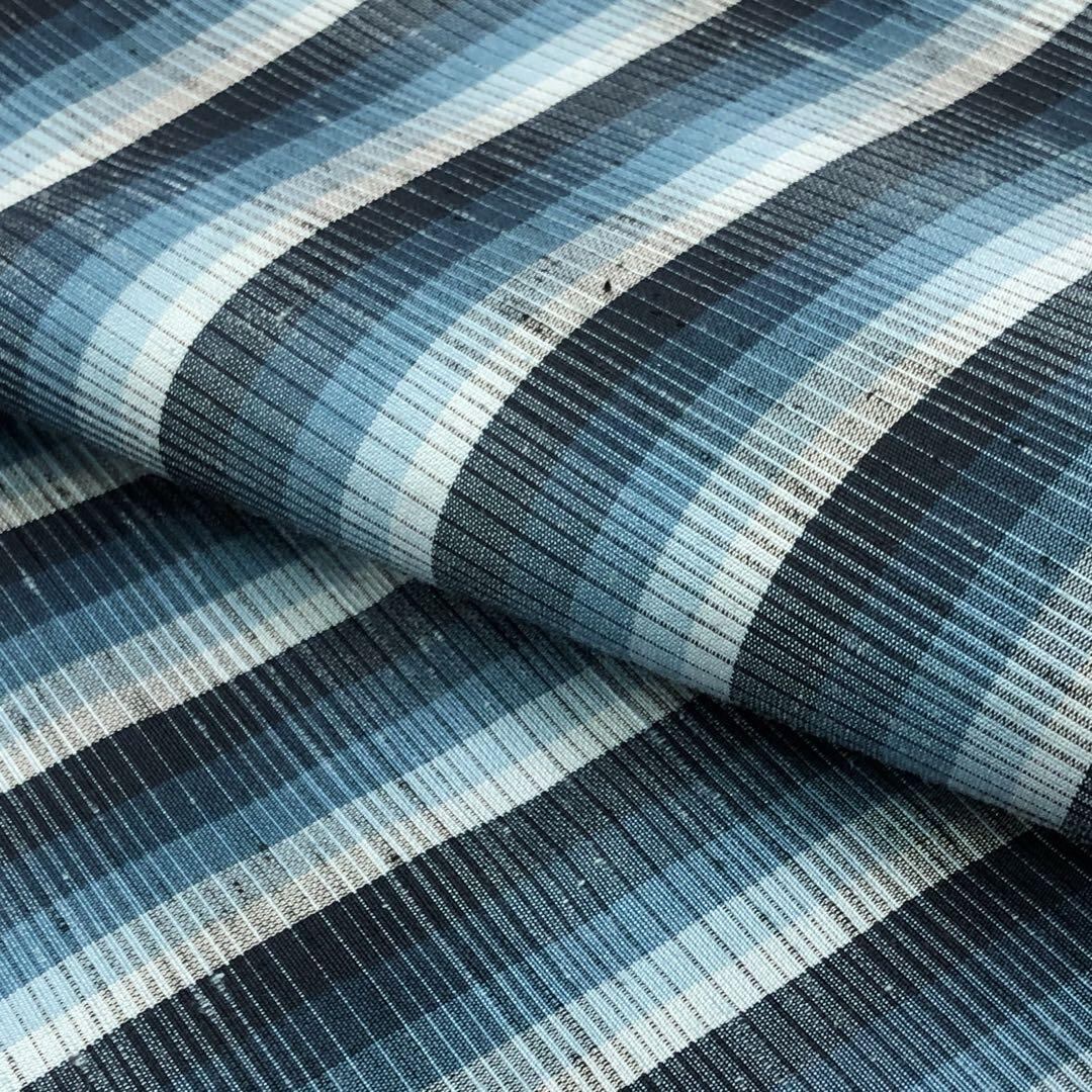 雰囲気の良い青味のグラデーションが美しい紬、縦縞模様の柄裄の素敵なお品でございます。