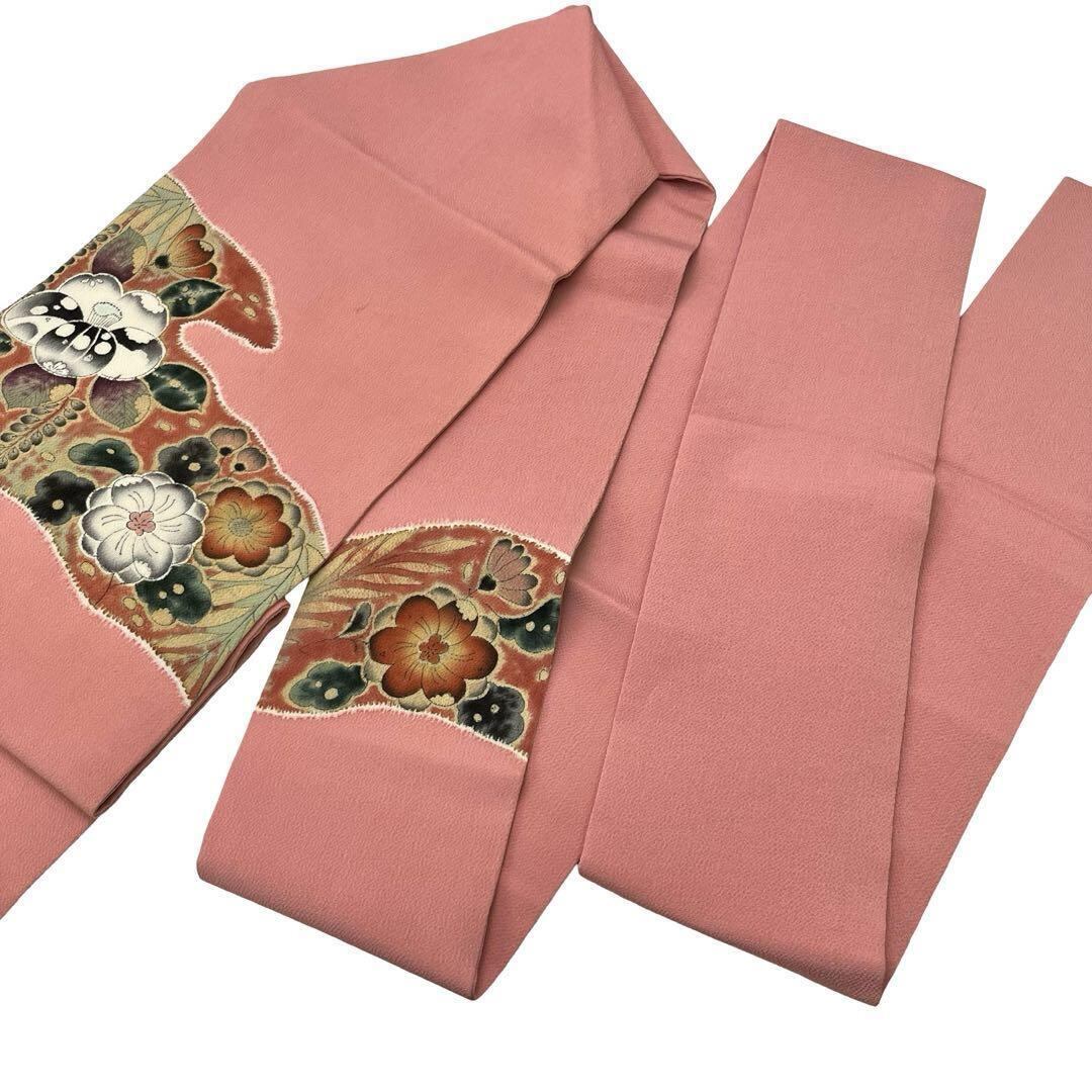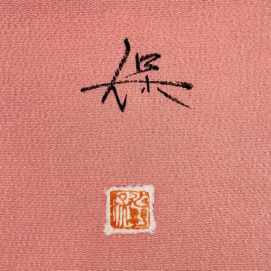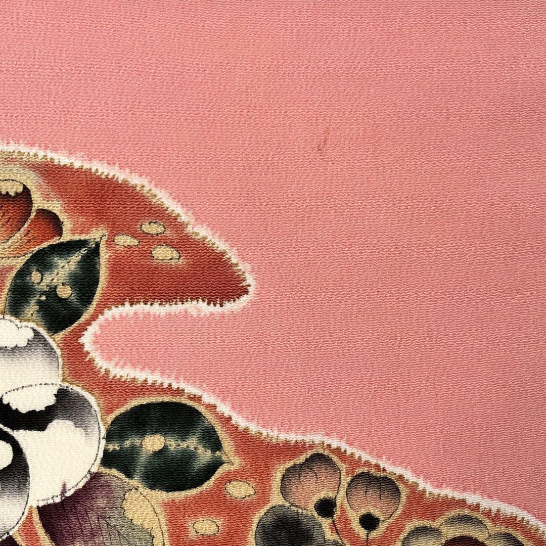 一重梅色の落ち着きのある桃色、辻が花の染柄がデザインされた素敵な雰囲気のお品でございます。