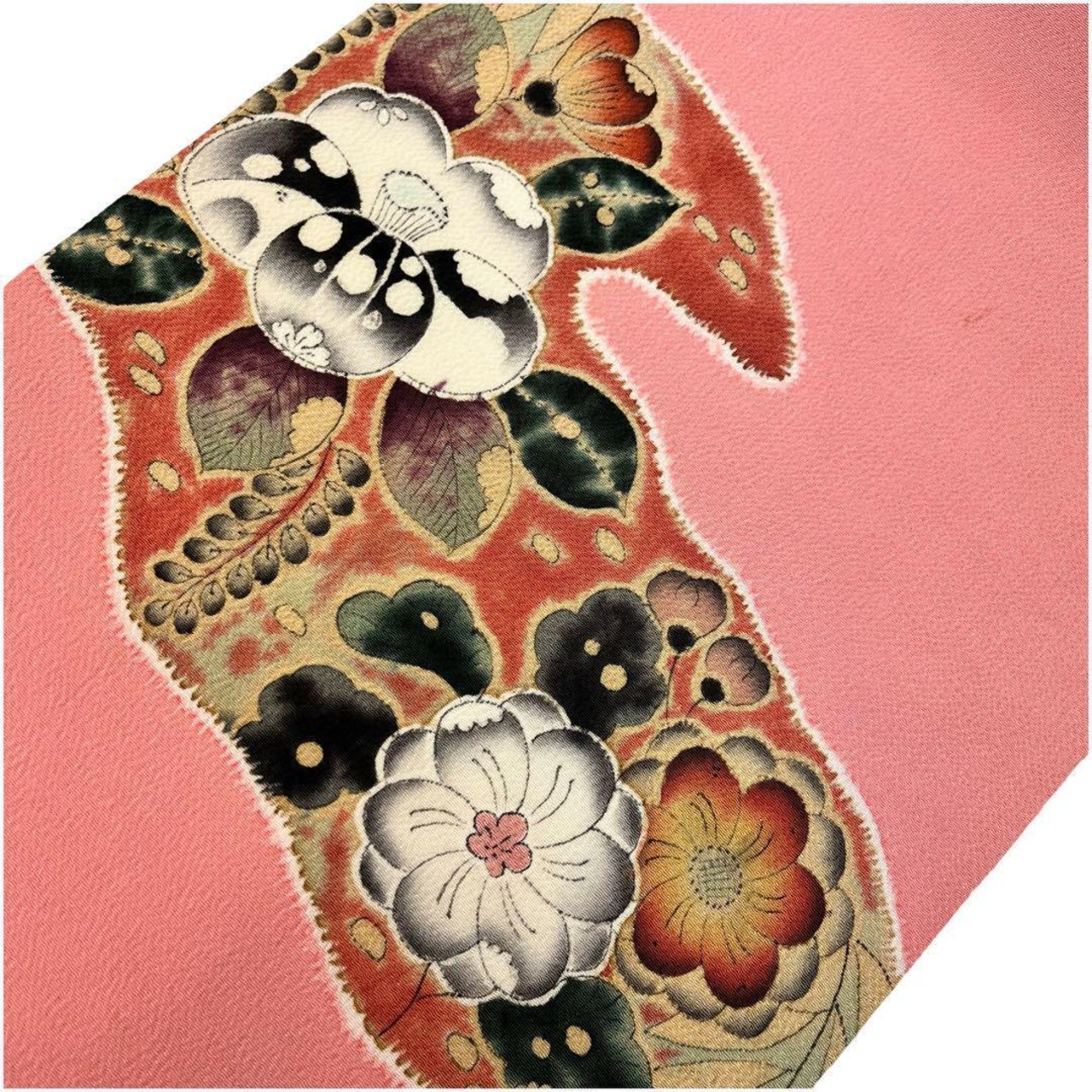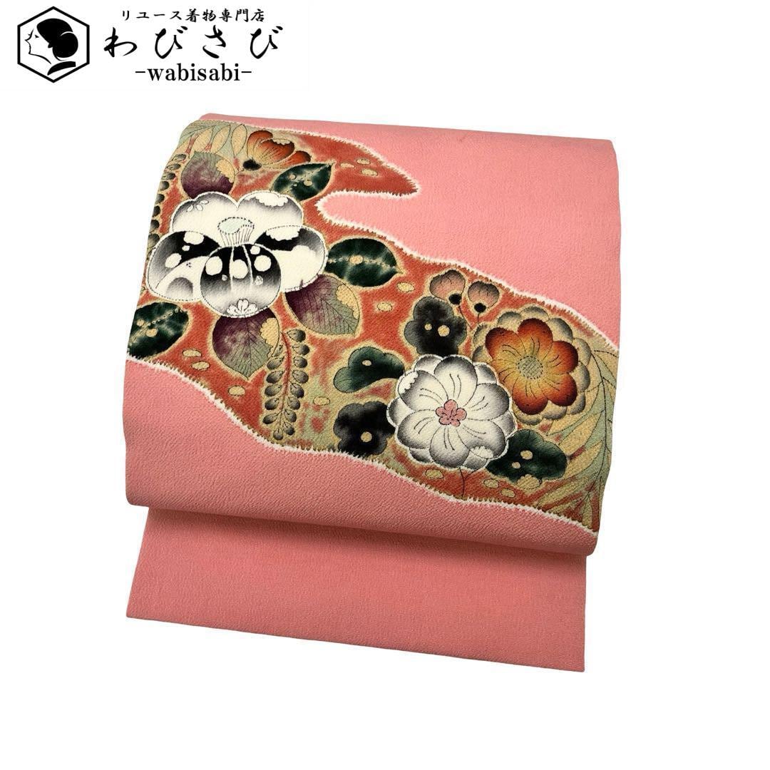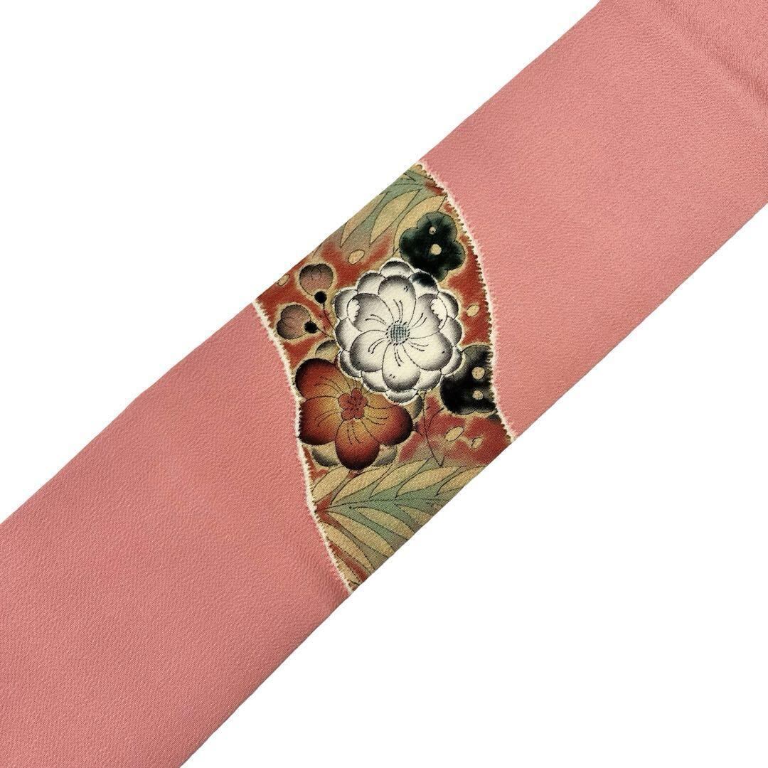 一重梅色の落ち着きのある桃色、辻が花の染柄がデザインされた素敵な雰囲気のお品でございます。
