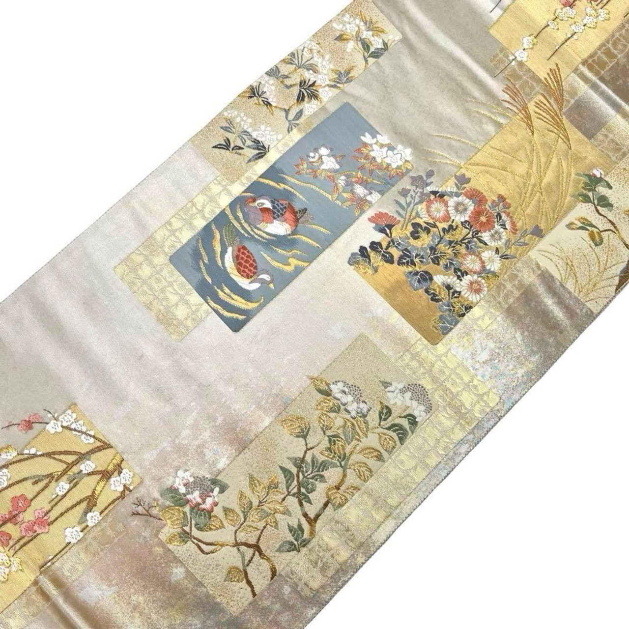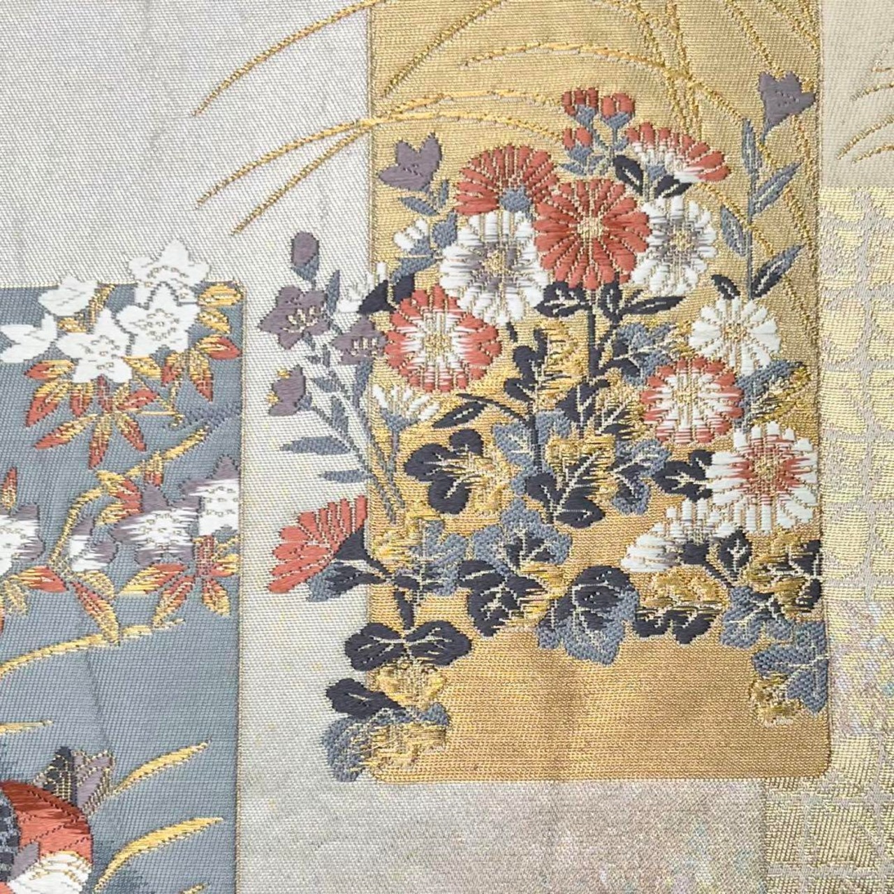 香漂花、短冊寿祥花鳥文と題された袋帯です。