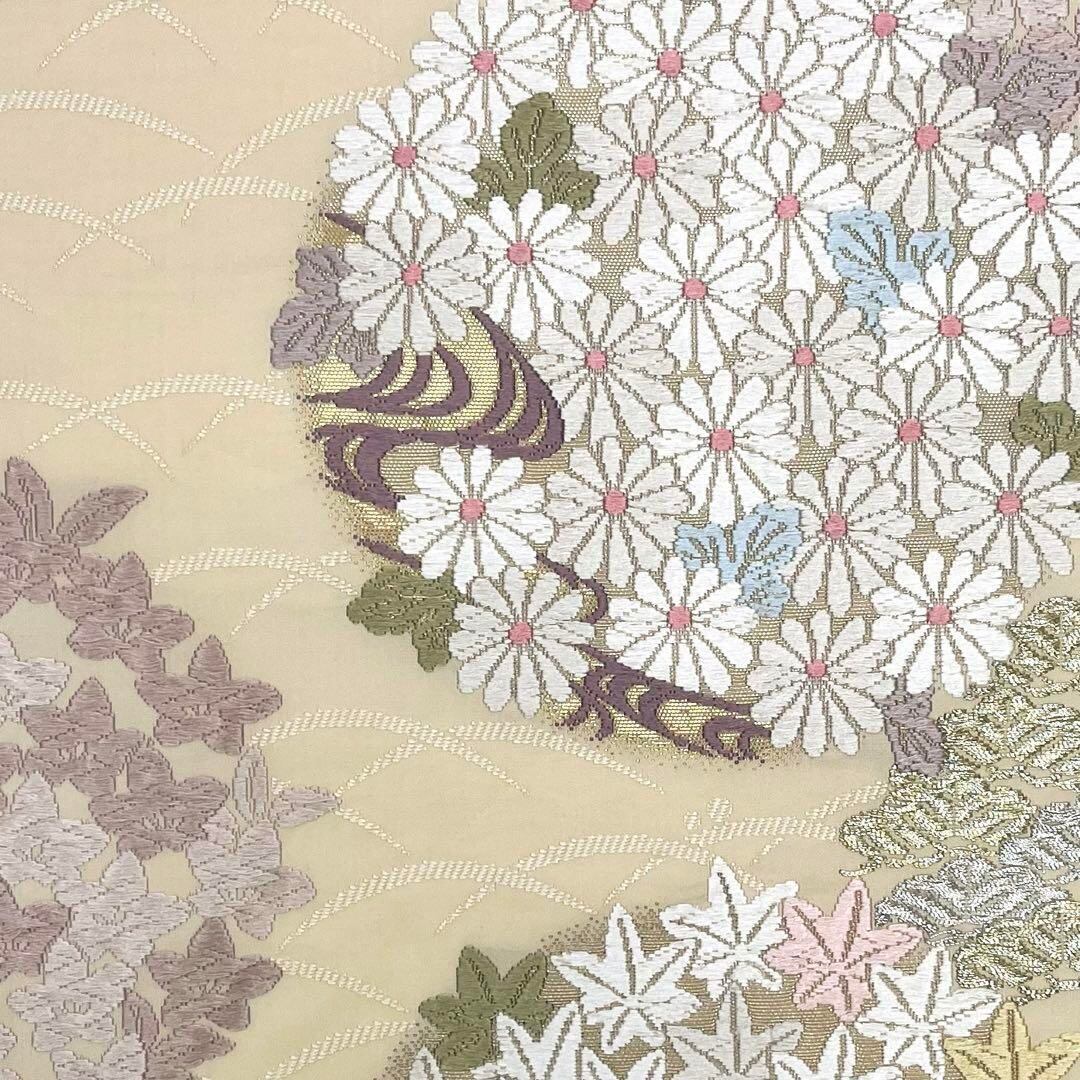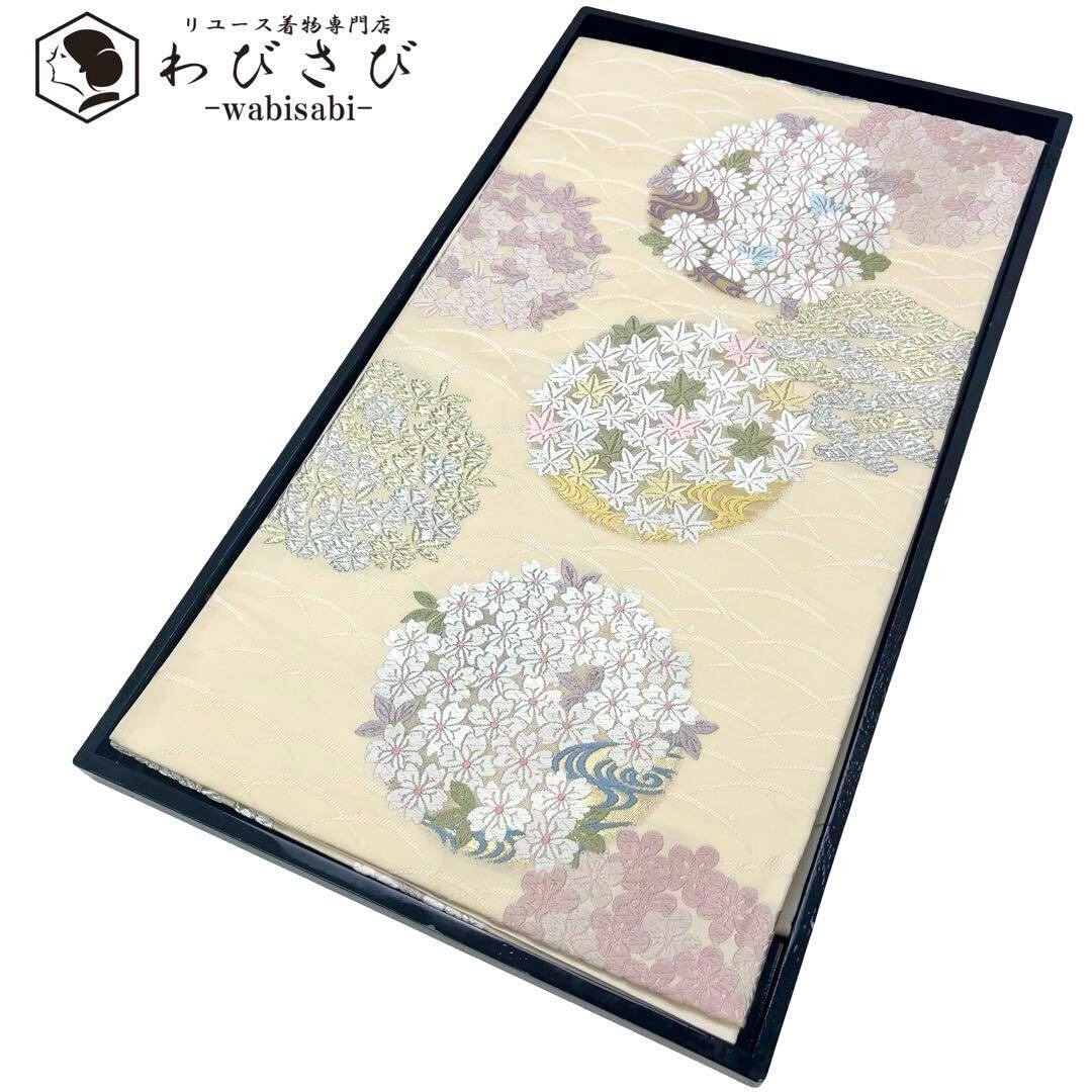 袋帯 緑茶染 卆寿 本金箔 丸に美しい花柄模様 金銀糸 薄卵色 O-4323