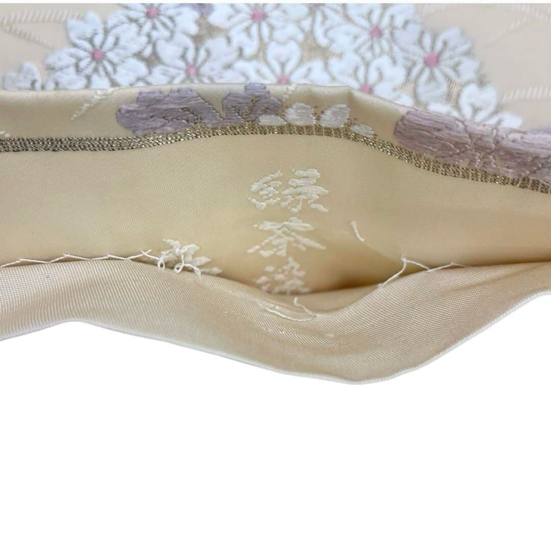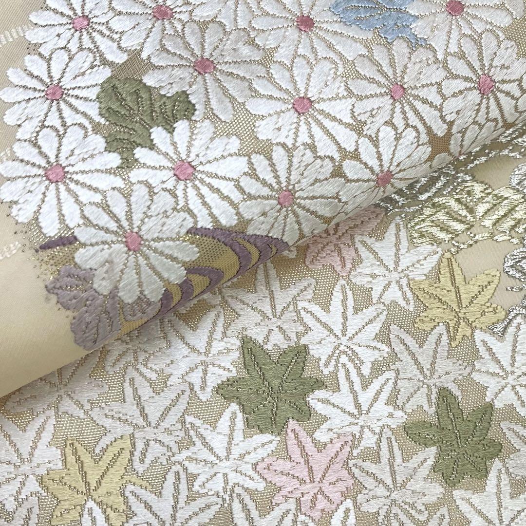 卆寿と題された薄卵色に本金箔、丸に美しい花模様がデザインされた上品な柄裄のお品でございます。