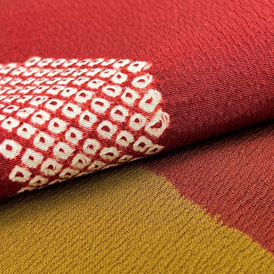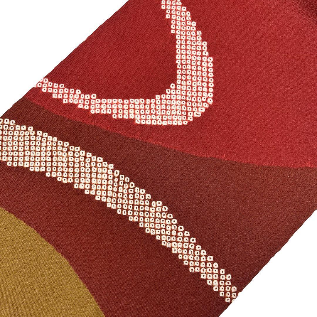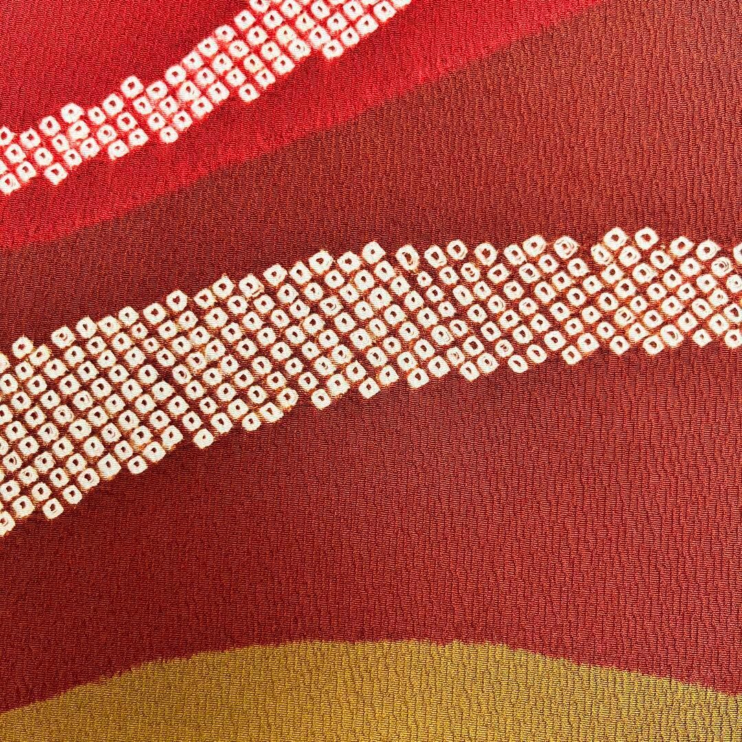 蘇芳色ベースの縮緬に染分けの彩りの良い色彩に鹿の子絞りでデザインされた素敵な柄裄のお品でございます。