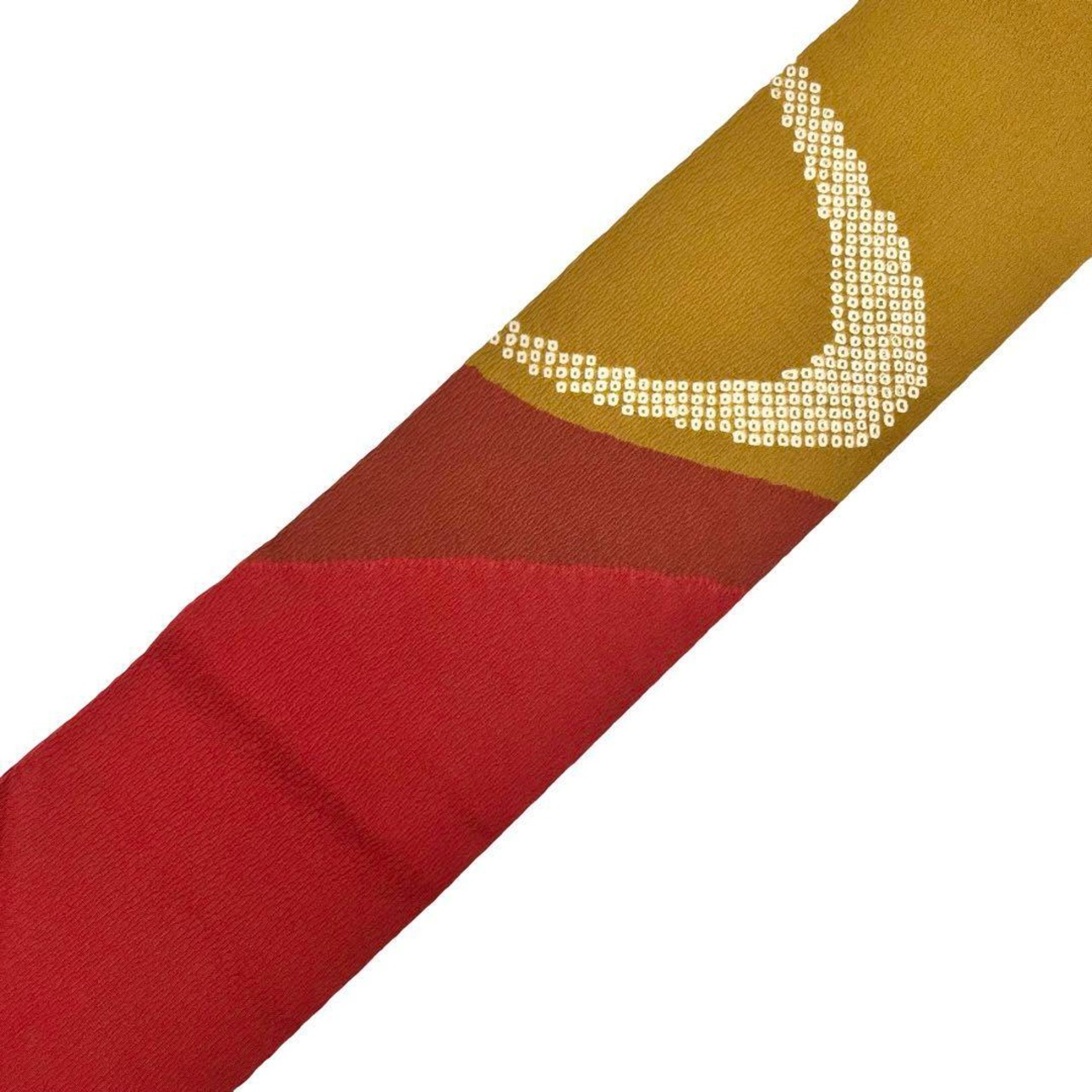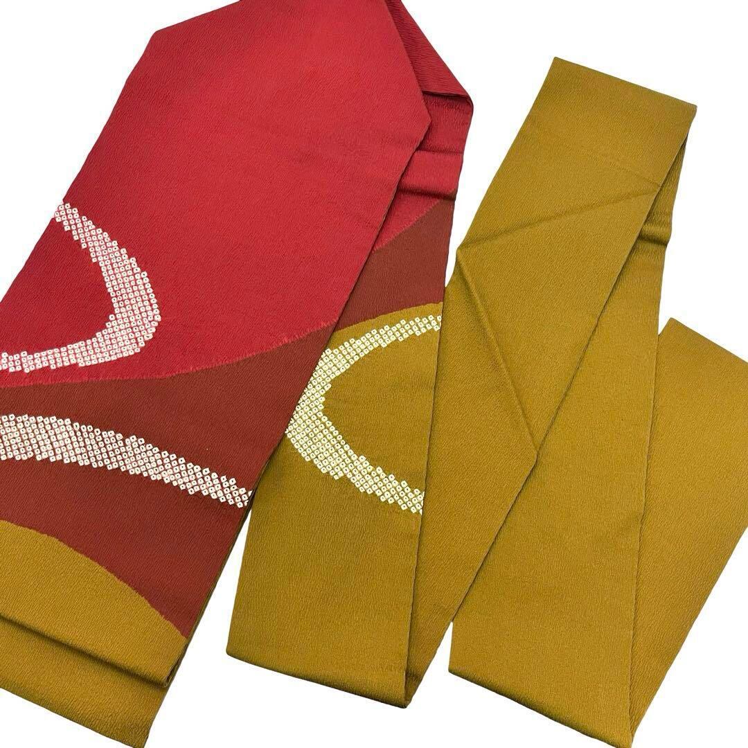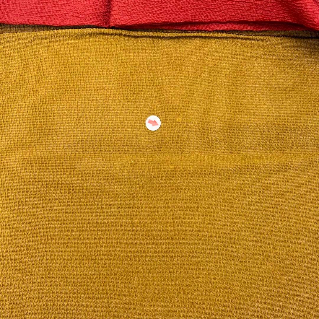 蘇芳色ベースの縮緬に染分けの彩りの良い色彩に鹿の子絞りでデザインされた素敵な柄裄のお品でございます。
