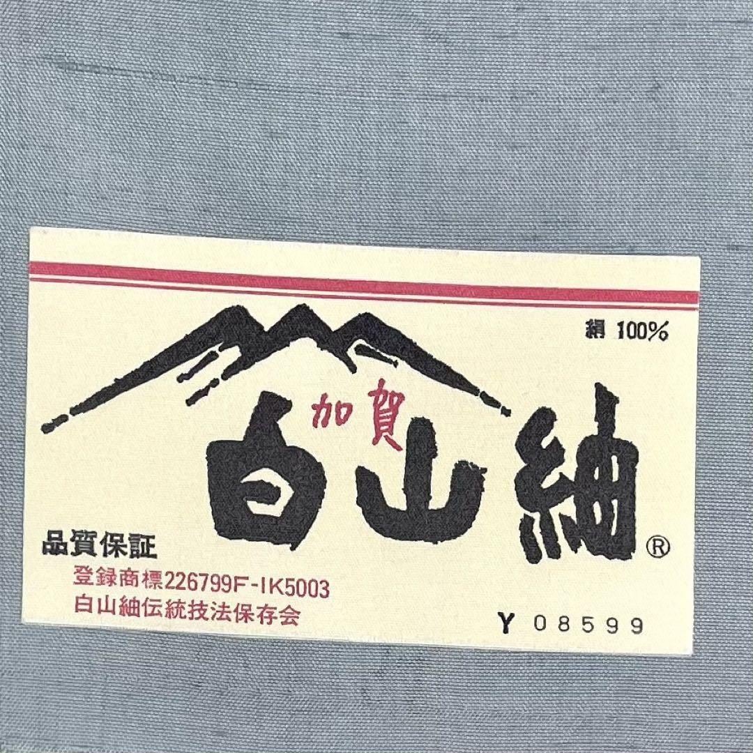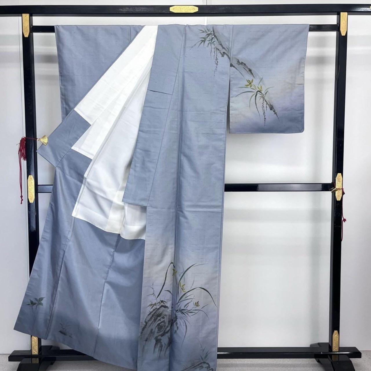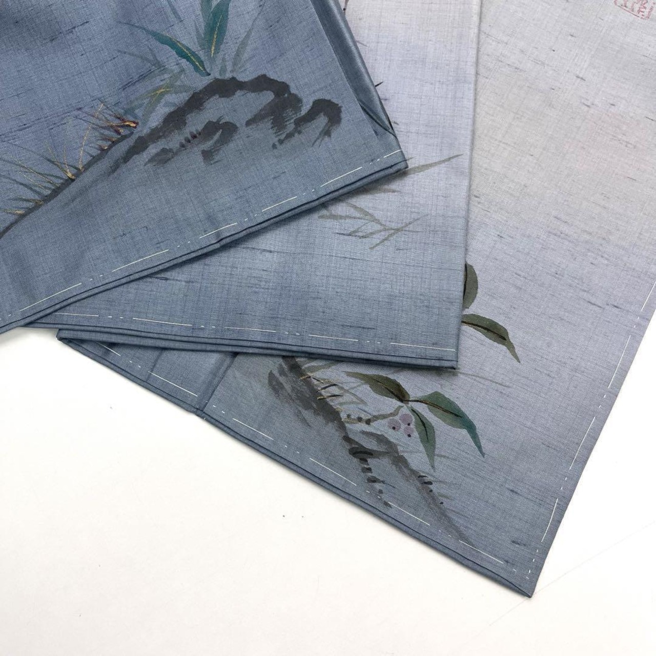 薄鈍色の落ち着きのある青味のお色の白山紬に手描きの花模様がデザインされた素敵な柄裄のお品でございます。