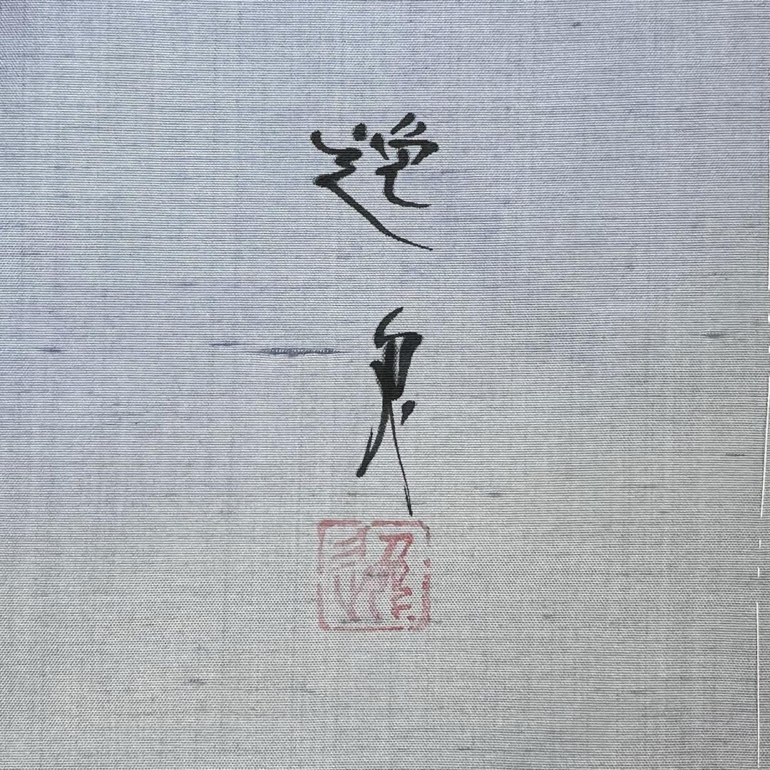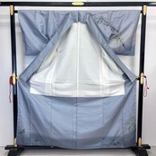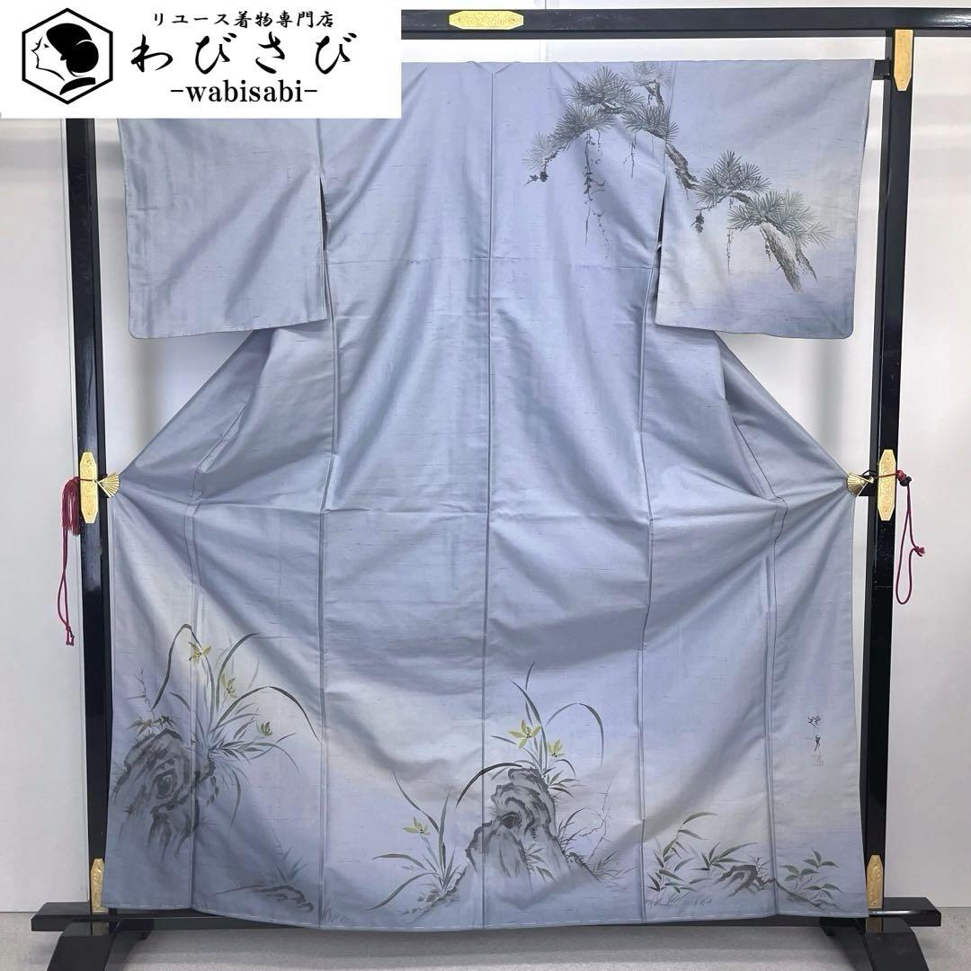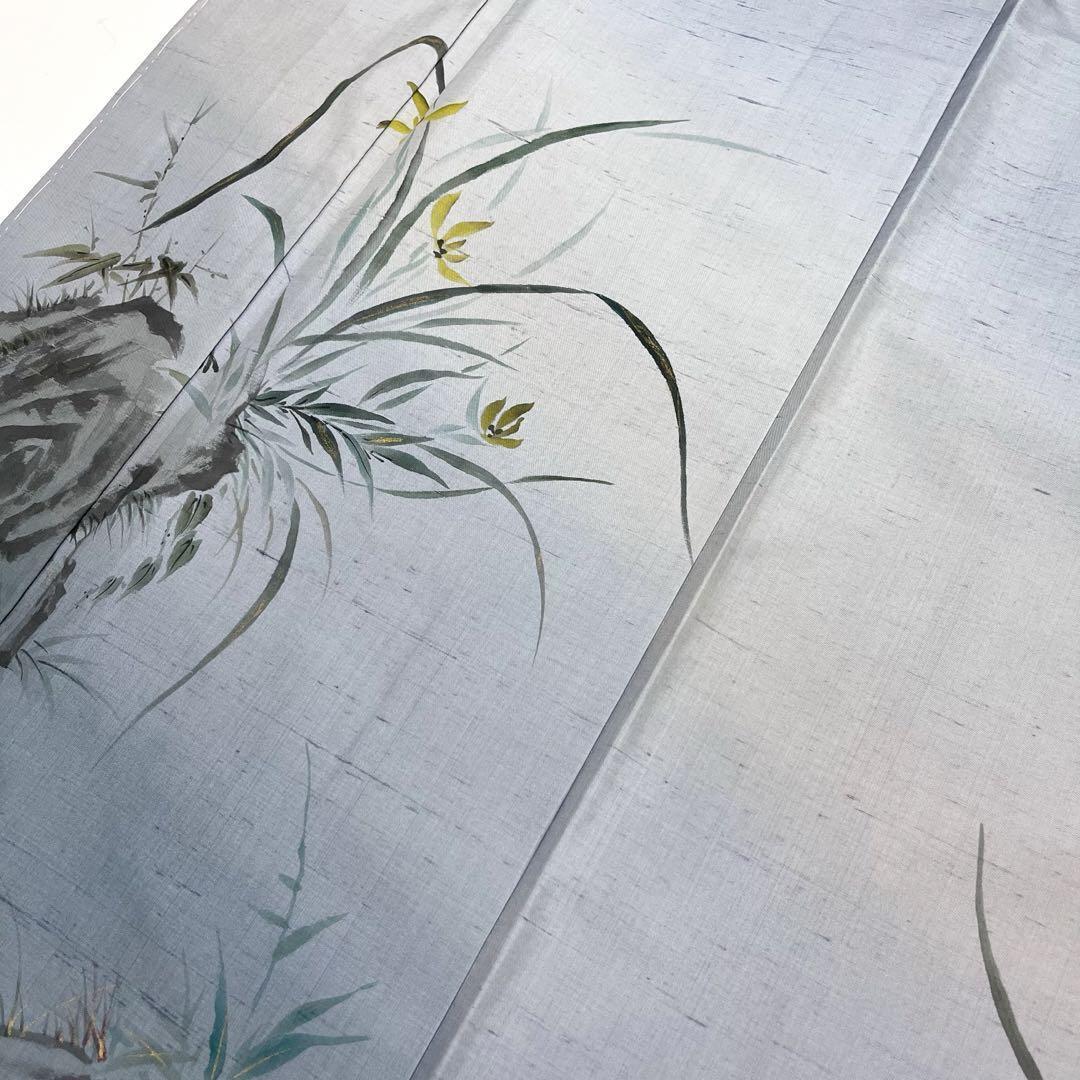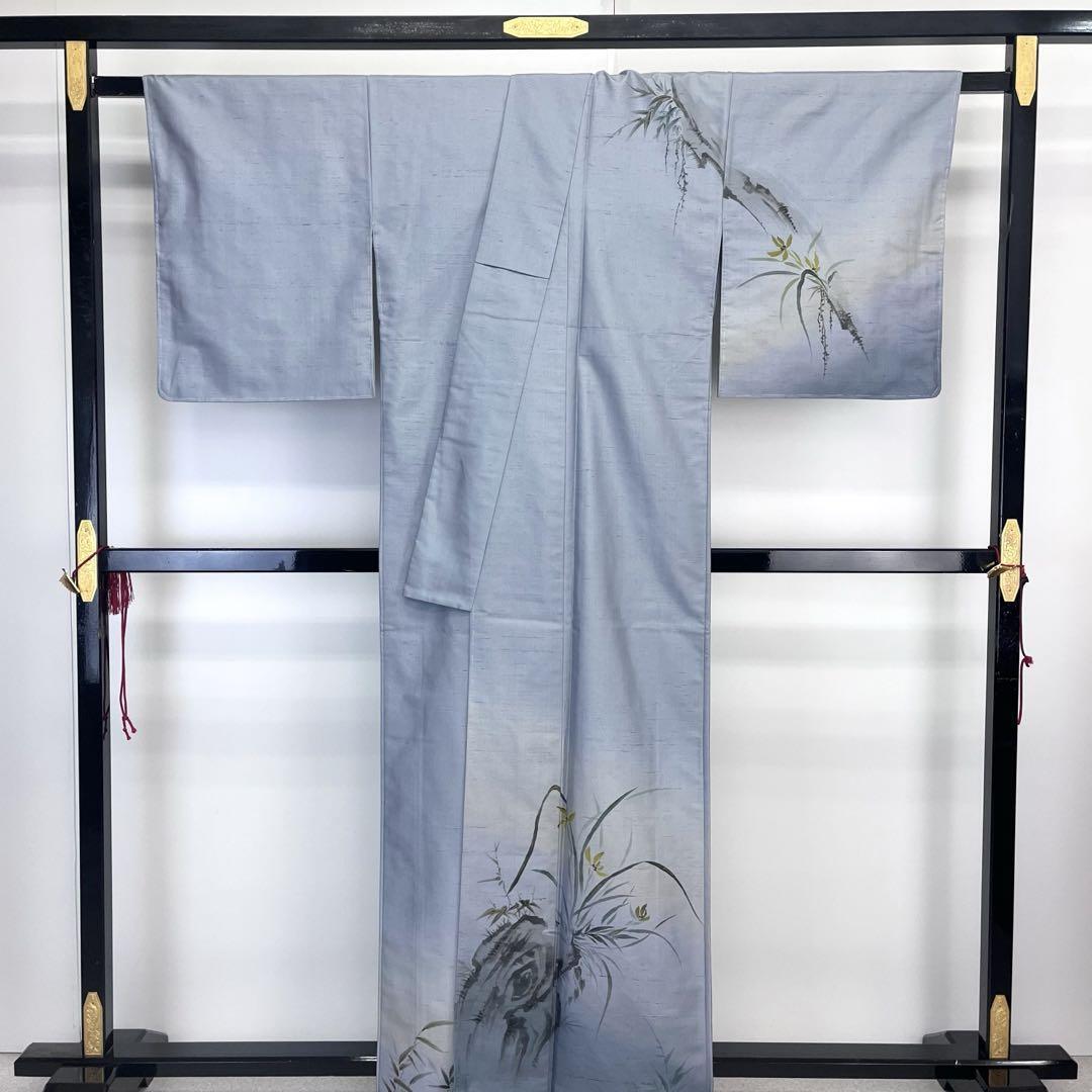 薄鈍色の落ち着きのある青味のお色の白山紬に手描きの花模様がデザインされた素敵な柄裄のお品でございます。