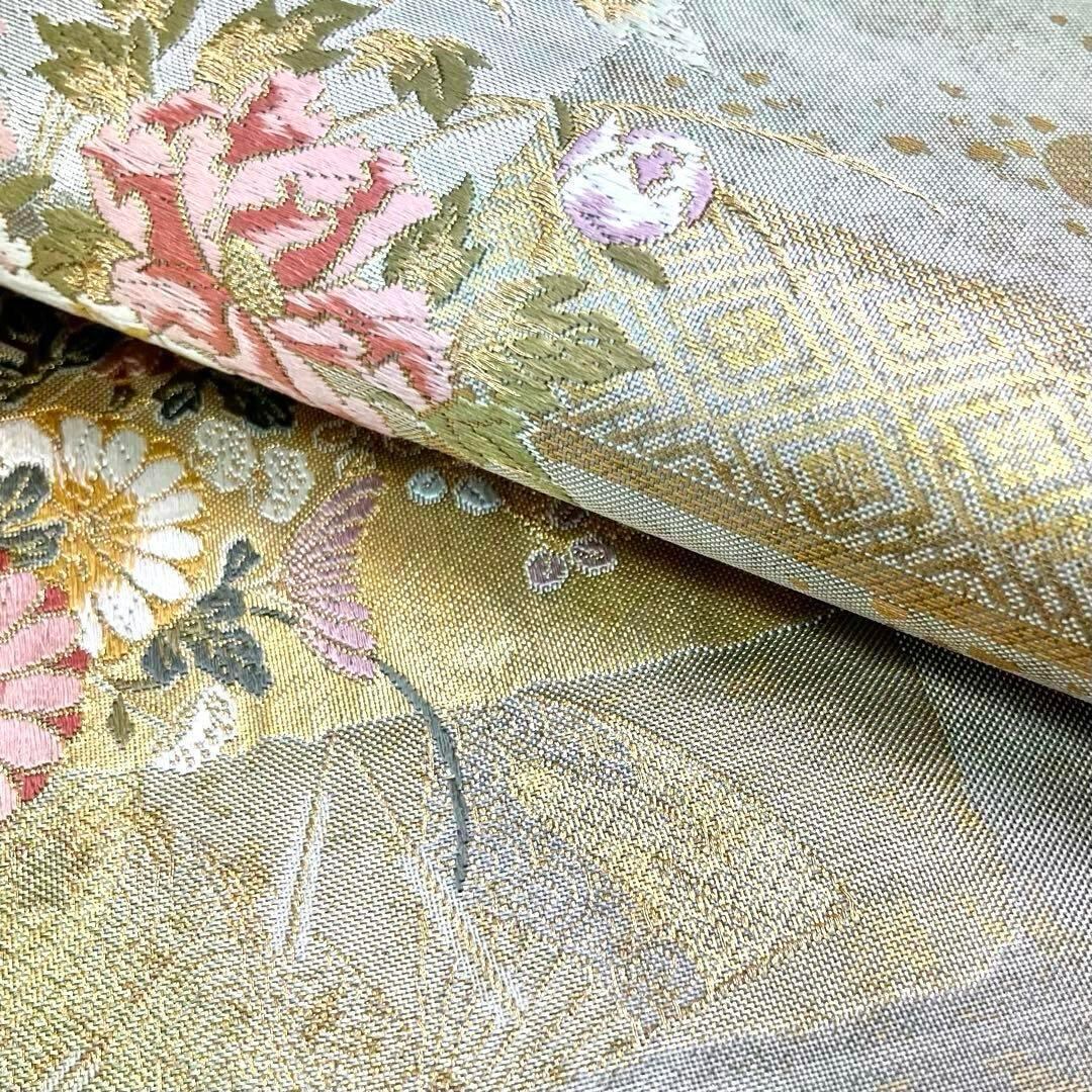銀色ベースのお色味に霞に牡丹や菊などの花柄模様がデザインされた煌びやかで素敵な柄裄のお品でございます。