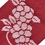 蘇芳色の落ち着いた赤味のお色に絞りでデザインされた花模様の柄裄が素敵なお品でございます。