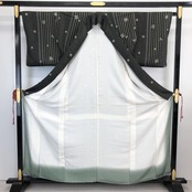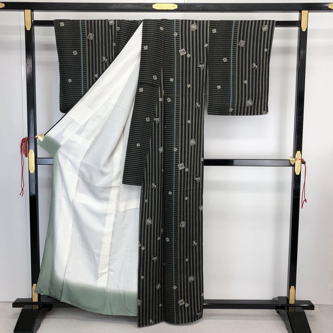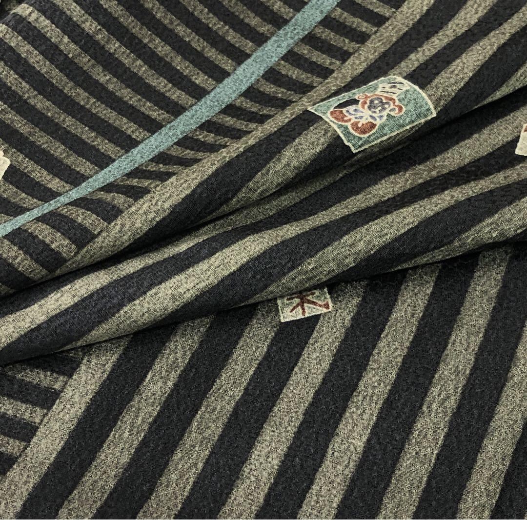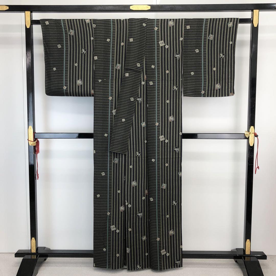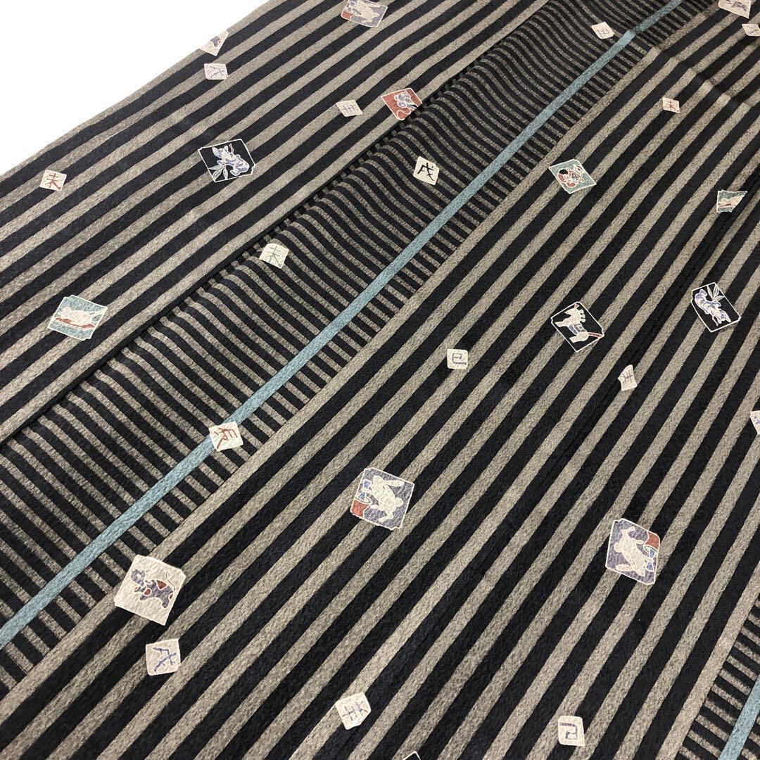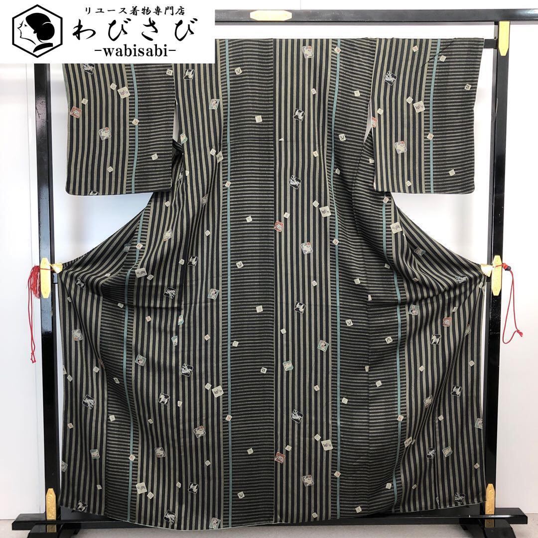 離寛茶色の落ち着きのあるお色味に縦横の縞模様に干支の柄裄が散りばめられた素敵な柄裄のお品でございます。