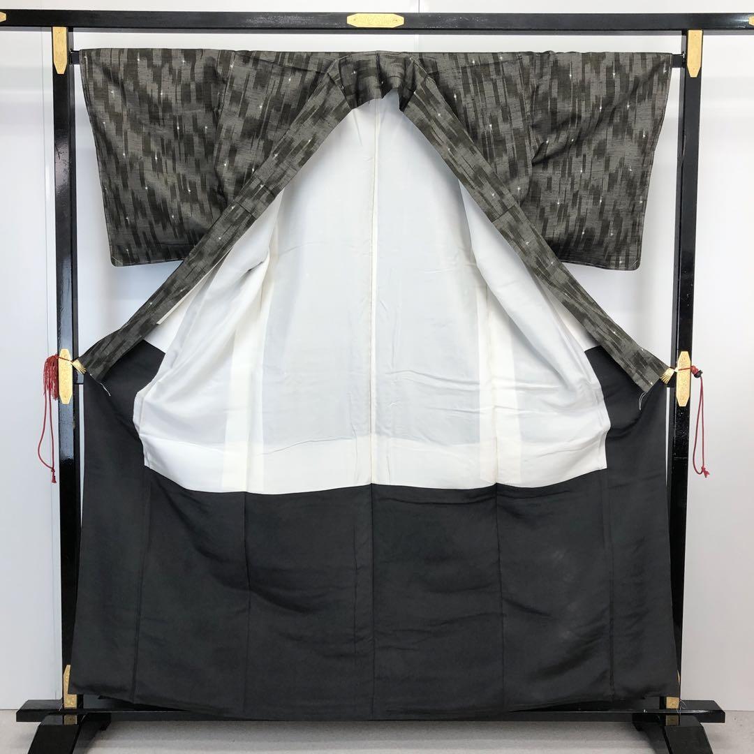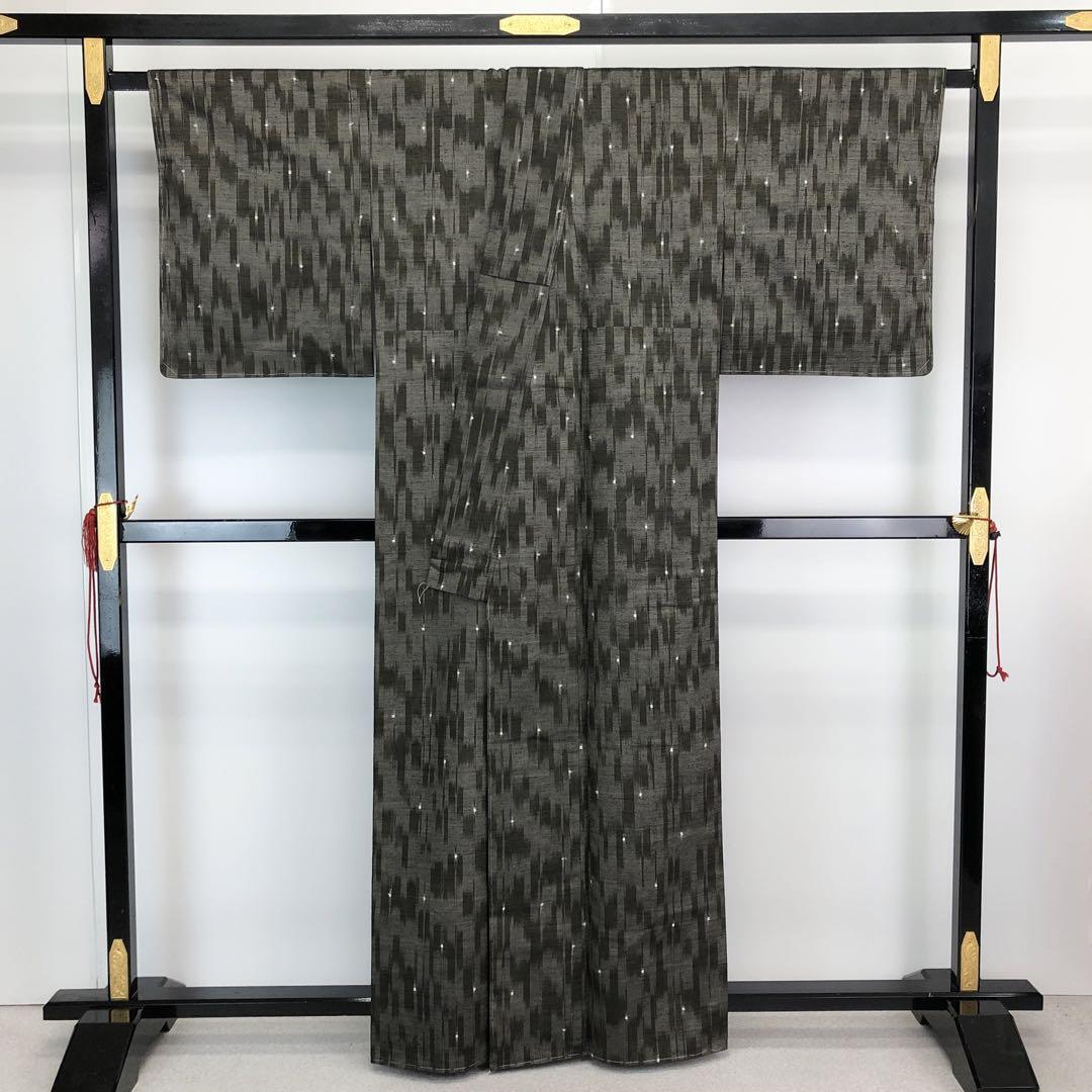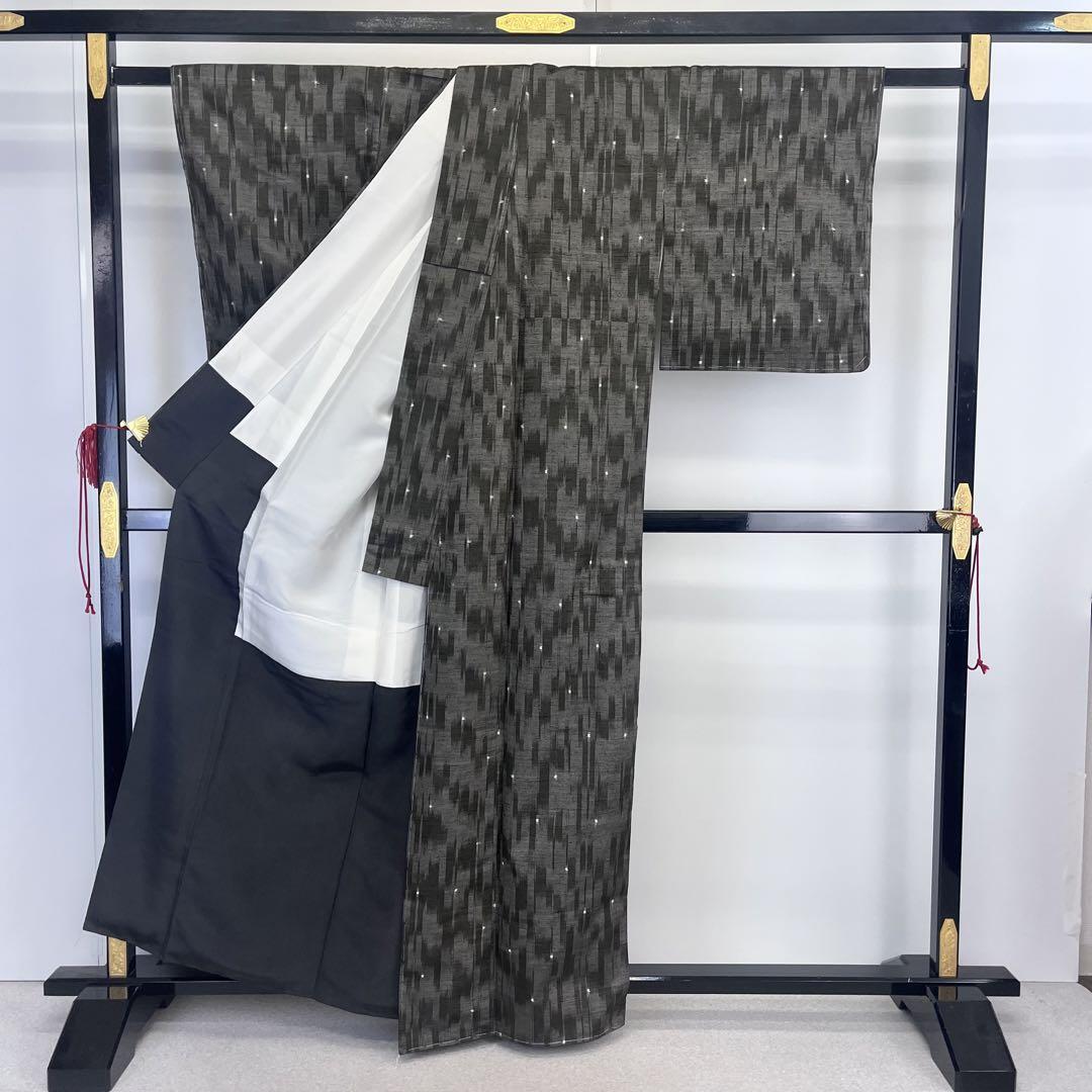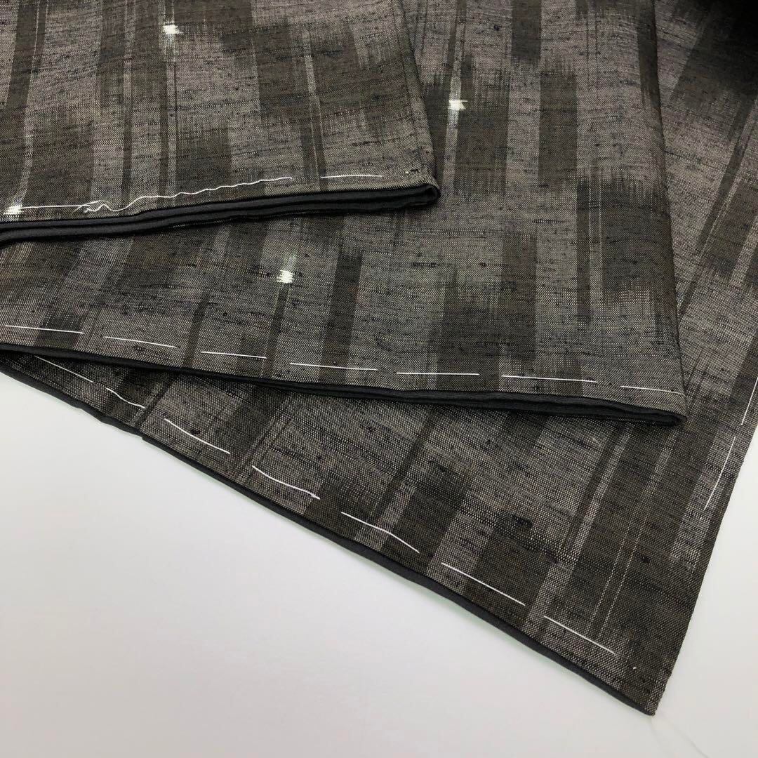 消炭色ベースのお色味に雰囲気の良い絣模様がデザインされた上質な紬地の素敵なお品でございます。