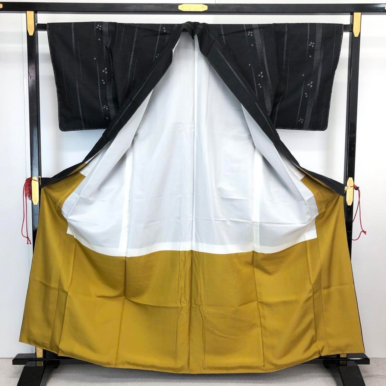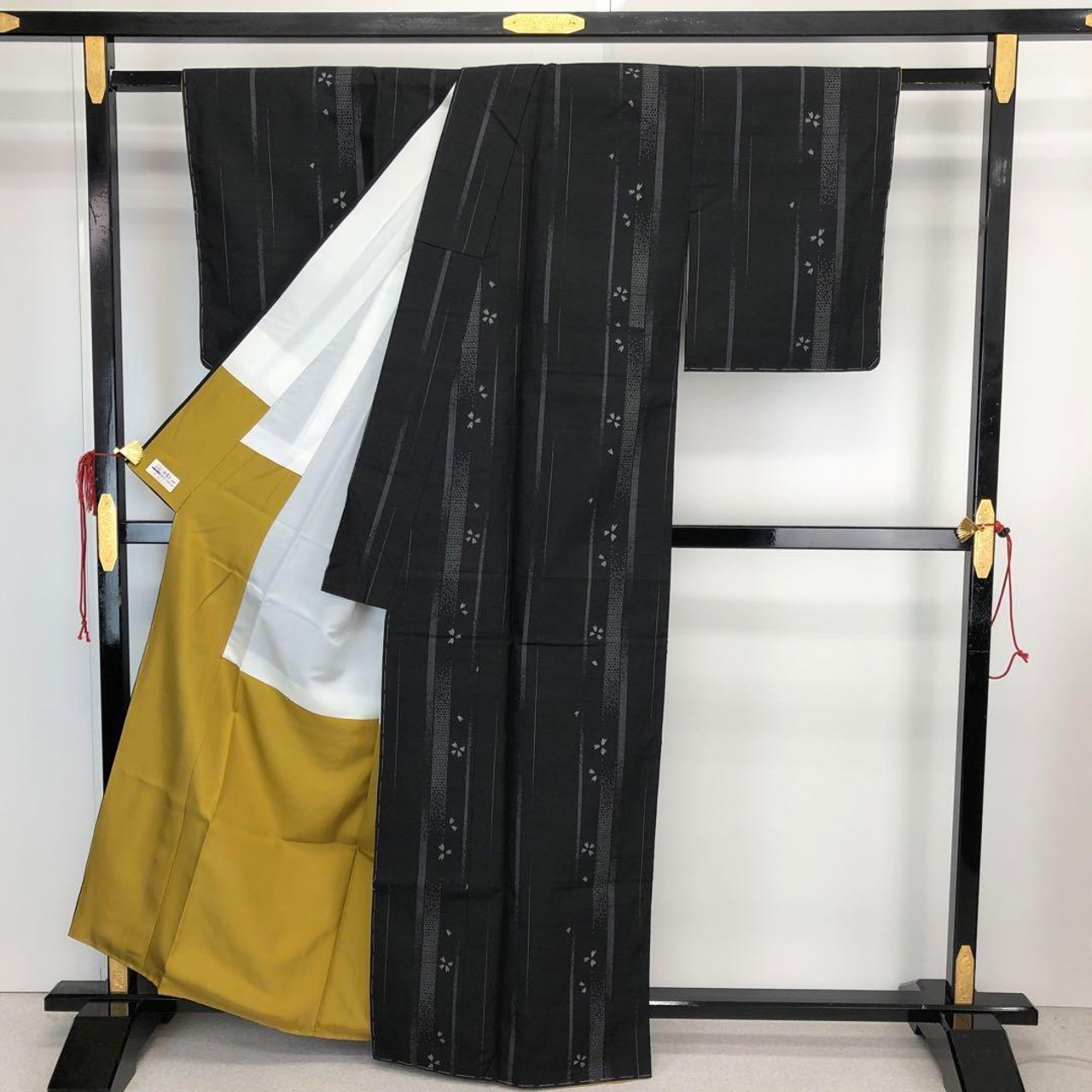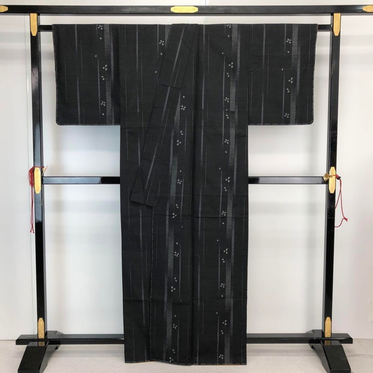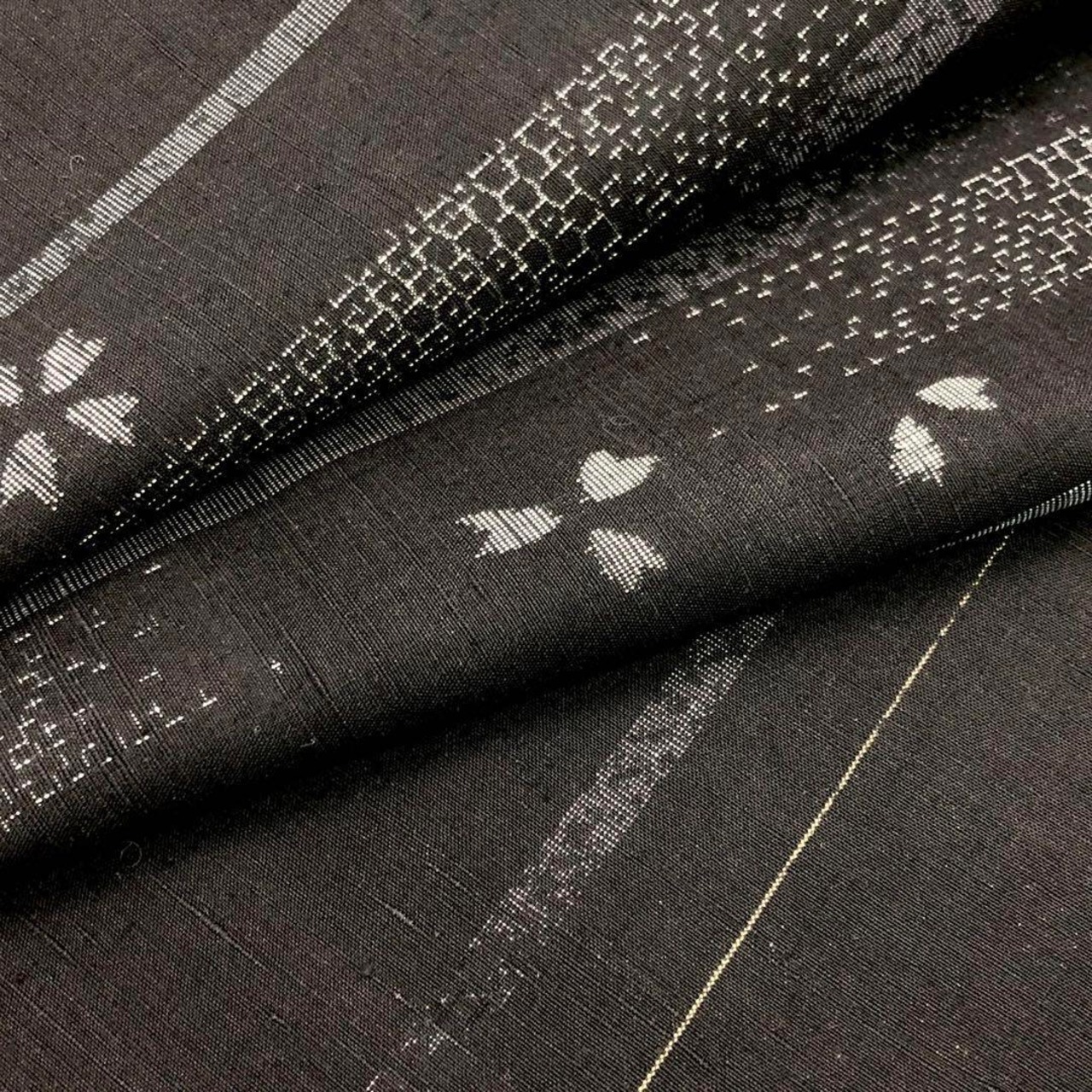 黒色ベースの手触りの良い紬地、縦縞模様に桜の花、亀甲などの柄行がデザインされた雰囲気の良い素敵なお品でございます。
