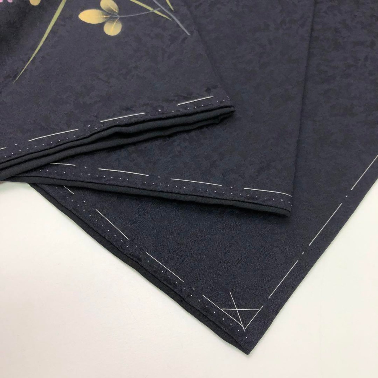 青褐色の落ち着いたお色味に手描きの上品な花模様がデザインされた素敵な柄裄のお品でございます。