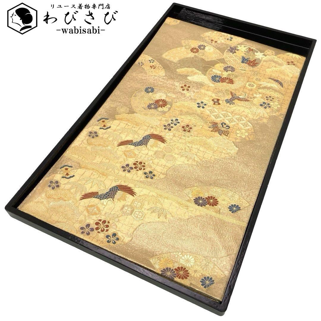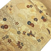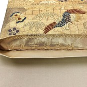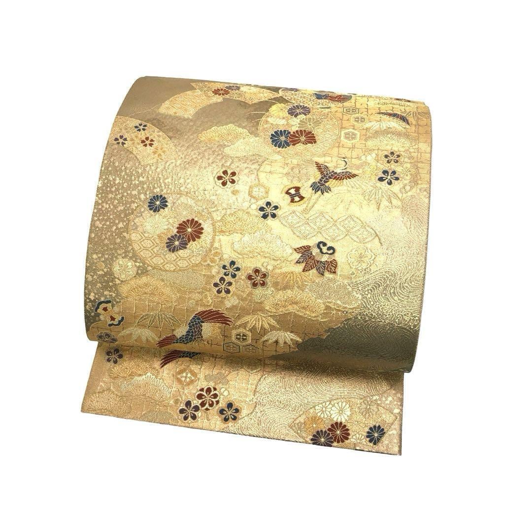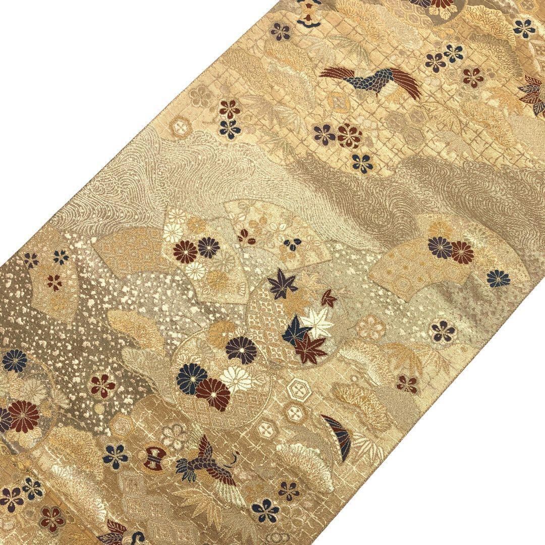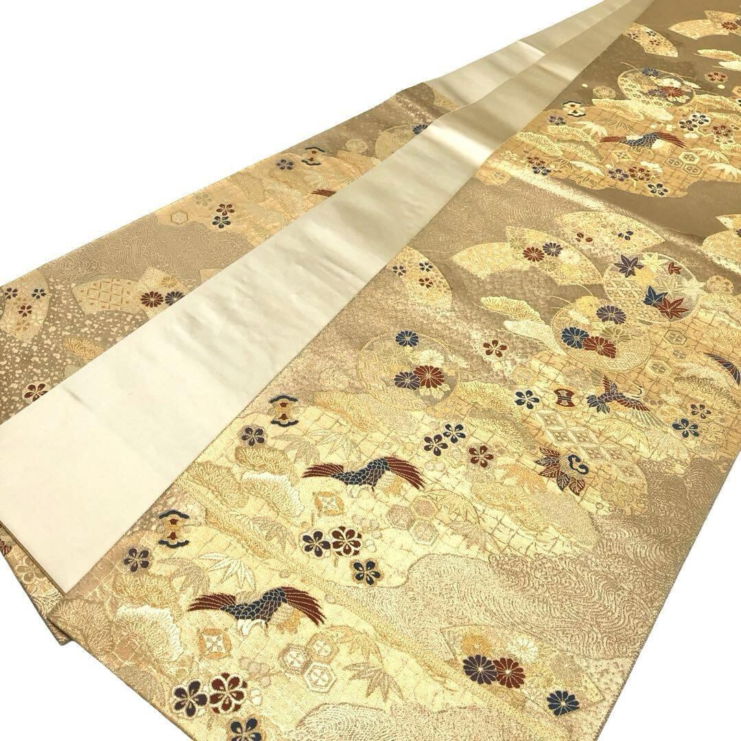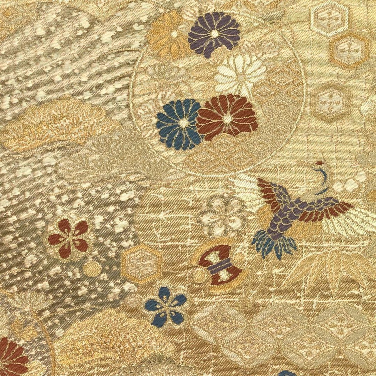 金色ベースの煌びやかなお色味に宝尽くし、花模様、鶴などの柄裄がデザインされた素敵なお品でございます。