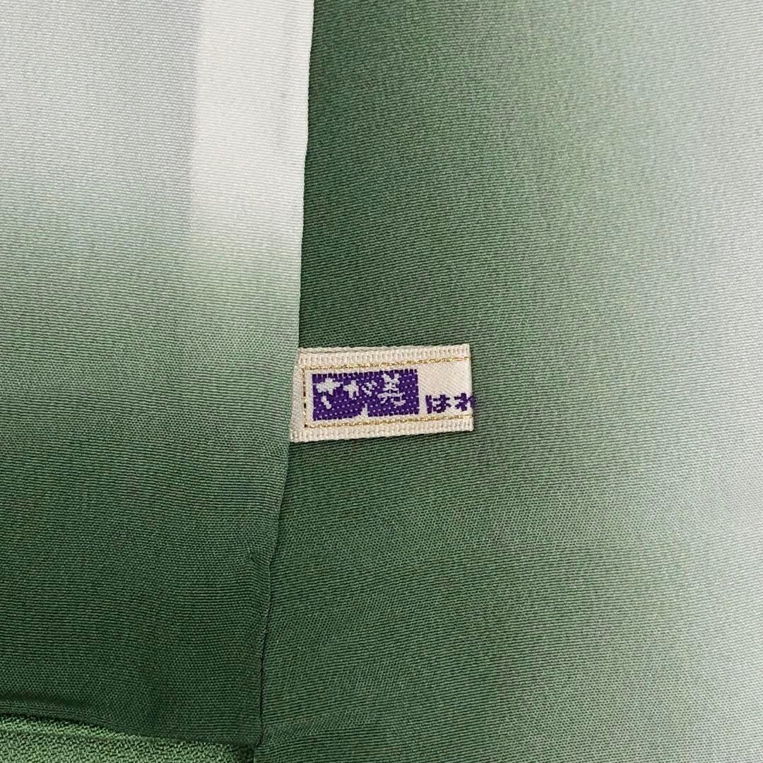 老竹色の縮緬に暈し、手描きの花模様がデザインされた素敵な柄裄のお品でございます。