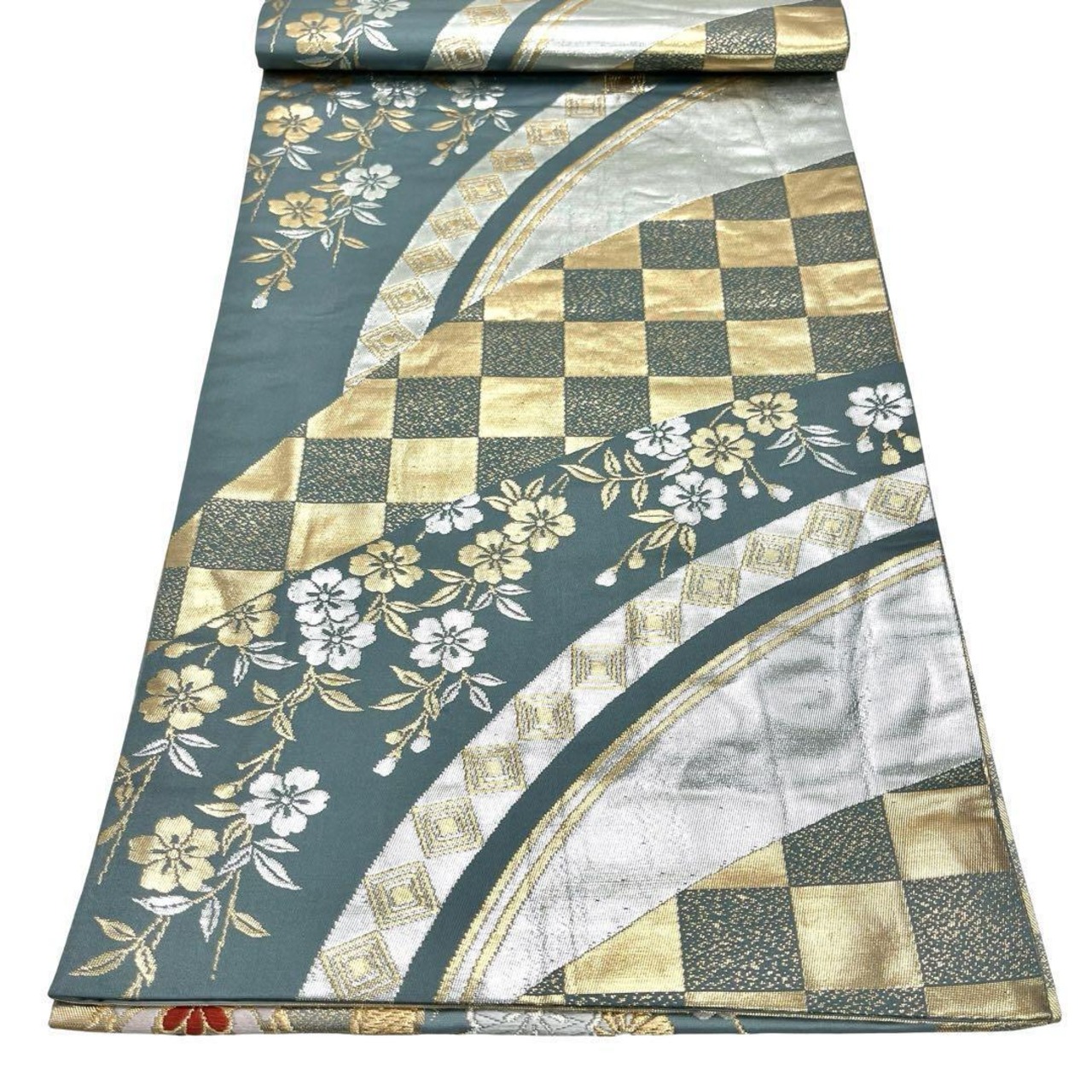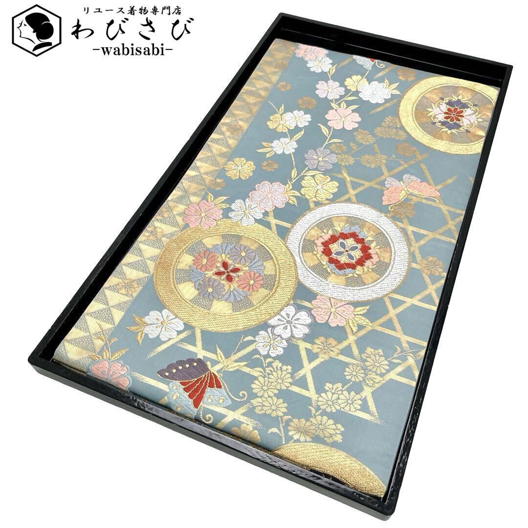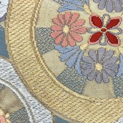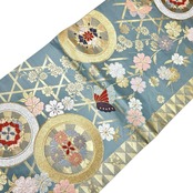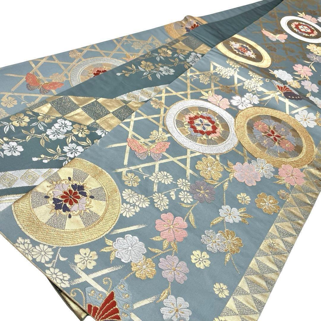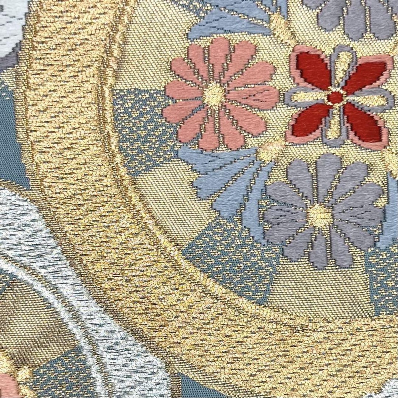 湊鼠色ベースの品のあるお色味、籠目、花柄模様、源氏香などの柄裄がデザインされた素敵なお品でございます。