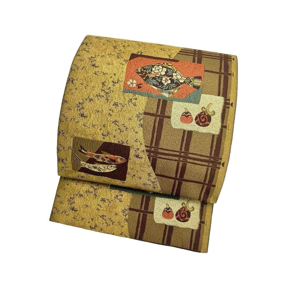 楊梅色のお色味にヒラメなどの魚柄、果物、枝葉模様の織柄でデザインされた素敵なお品でございます。