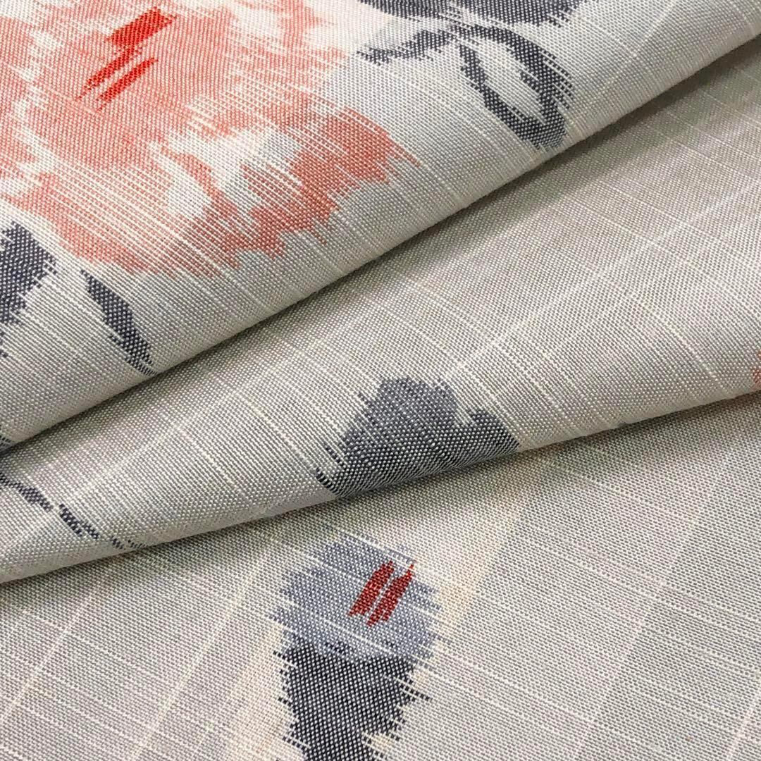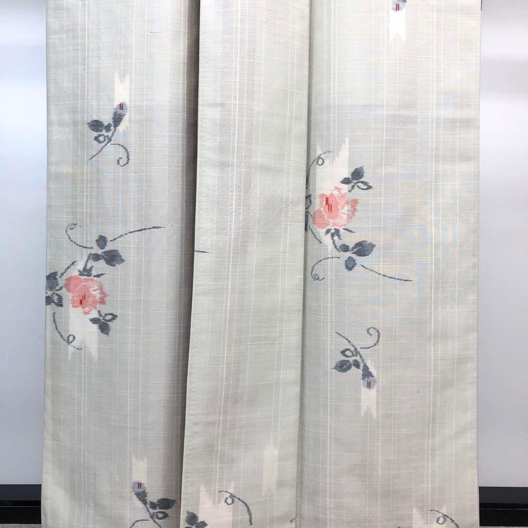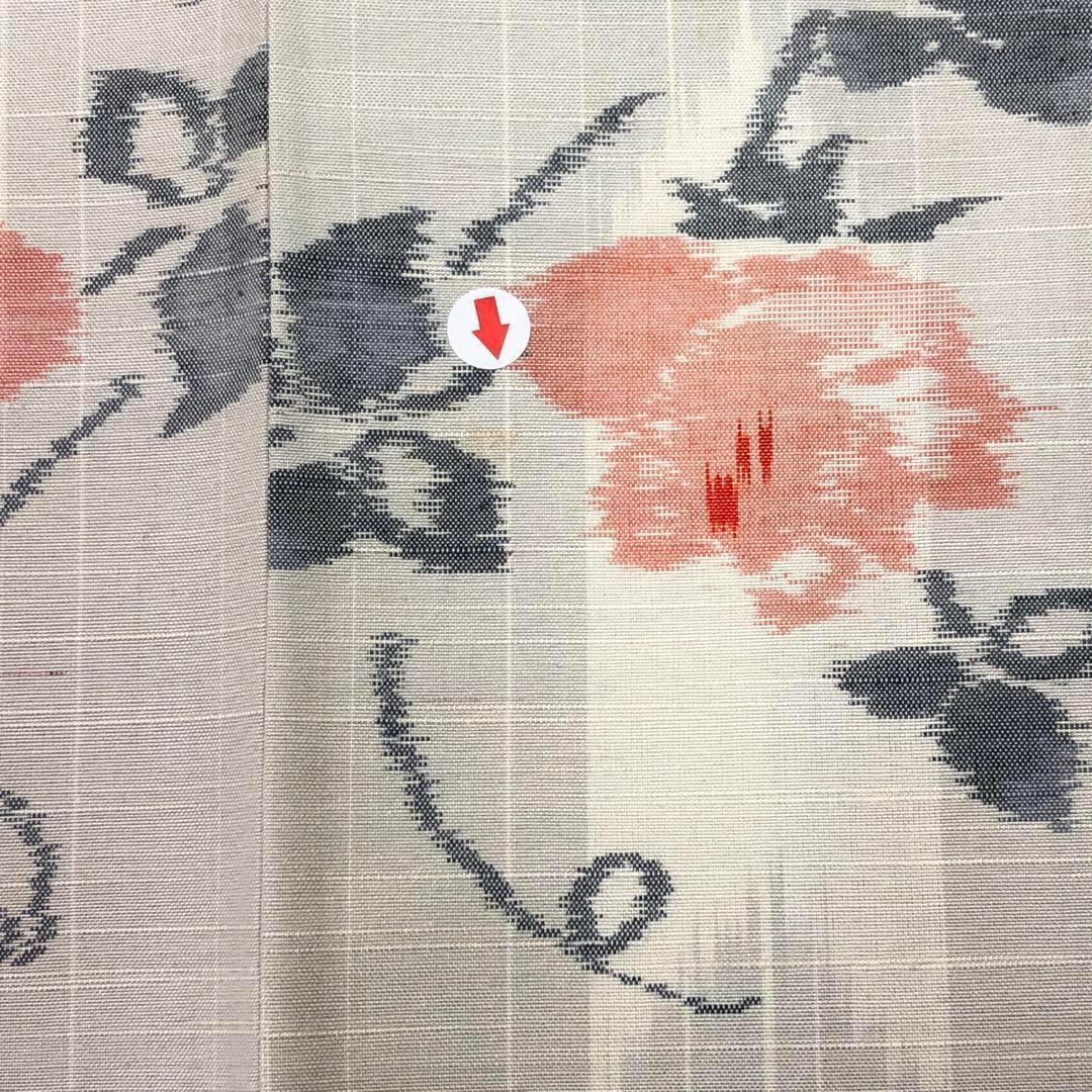 卯の花色の上品なお色味の紬地に赤い花模様、矢羽柄がデザインされた素敵な柄裄のお品でございます。